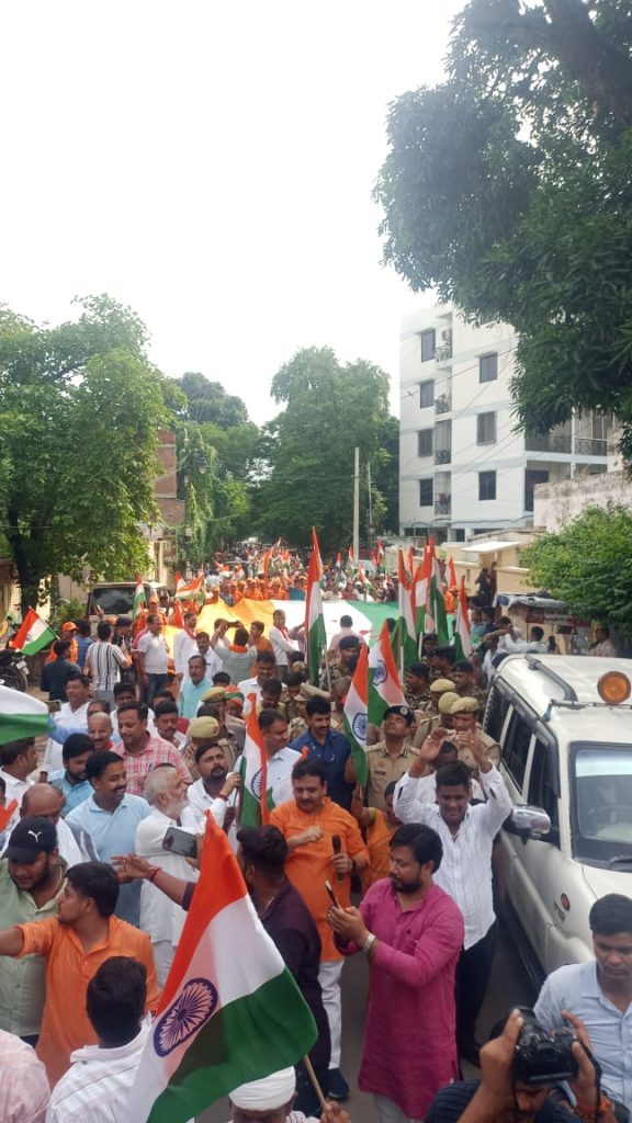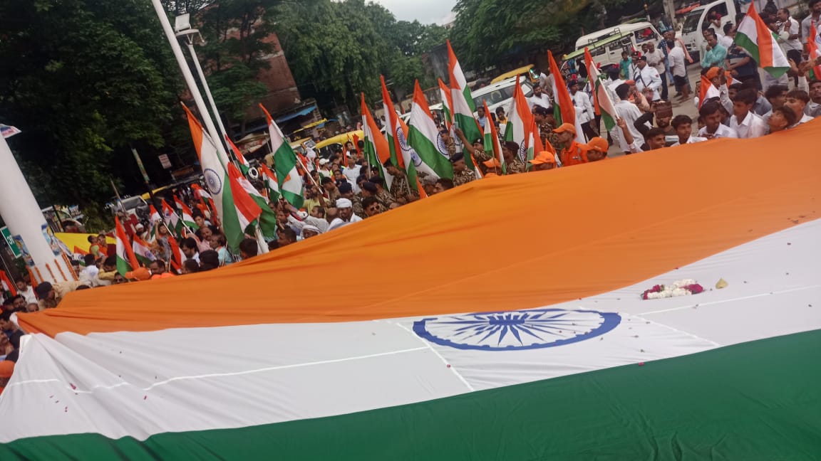 वाराणसी। उत्तर प्रदेश के स्टांप एवं न्यायालय पंजीयन शुल्क राज्य मंत्री (स्वतंत्र प्रभार) रविन्द्र जायसवाल ने स्वतंत्रता दिवस कार्यक्रम को पूरे जोश एवं हर्षोल्लास के साथ मनाये जाने के साथ ही 13-15 अगस्त तक मनाये का रहे "हर घर तिरंगा" कार्यक्रम के अंतर्गत अपने-अपने घरों पर राष्ट्रीय ध्वज को अवश्य लगाए जाने की लोगों से अपील की है। उन्होंने मंगलवार को आशापुर चौराहे पर लगाये जाने वाले देश की आन-बान-शान का प्रतीक राष्ट्रीय ध्वज स्थल का लोकार्पण कर 100 फीट के राष्ट्रीय ध्वज को फहराया। इस अवसर पर सेना, पीएसी व पुलिस के बैंड पार्टी के जवानों द्वारा राष्ट्र भक्ति के गीतों का धुन बजाया गया। जुलूस के रूप में हजारों की संख्या में लोग विशाल राष्ट्रीय ध्वज को ससम्मान हाथों में ले चल रहे थे। जिससे पूरा माहौल जंग-ए-आजादी के संदेश से ओत प्रोत हो गया। इस अवसर पर जिलाधिकारी एस. राजलिंगम, अपर पुलिस कमिश्नर एस. चिनप्पा, एनडीआरएफ के अधिकारी आदि लोग प्रमुख रूप से उपस्थित रहे।