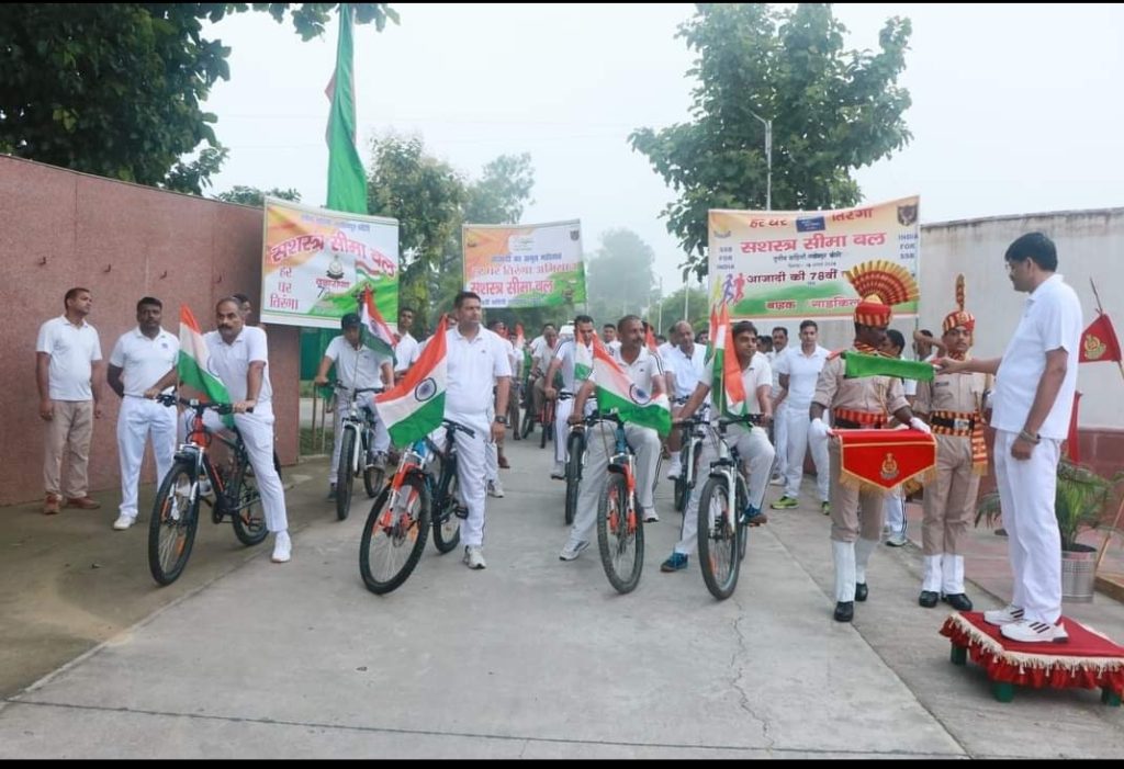 लखीमपुर खीरी में आज दिनांक 14.08.2024 को तृतीय वाहिनी स.सी.बल, लखीमपुर खीरी में . वि.विक्रमण, उप महानिरीक्षक, क्षेत्रक मुख्यालय ,स.सी.बल,लखीमपुर खीरी के अध्यक्षता में आजादी के अमृत महोत्सव के उपलक्ष्य में "हर घर तिरंगा" के तहत क्षेत्रक मुख्यालय ,स.सी.बल,लखीमपुर खीरी ,तृतीय वाहिनी, लखीमपुर खीरी एवं 70 वी वाहिनी, लखीमपुर खीरी II के द्वारा लखीमपुर क्षेत्र में नागरिकों को जागरूक करने हेतु साइकिल /मोटरसाइकिल रैली का आयोजन किया गया हैं l इस कार्यक्रम के दौरान वि.विक्रमण, उप महानिरीक्षक , क्षेत्रक मुख्यालय स.सी.बल,लखीमपुर खीरी के द्वारा इंटर सेक्टर खेल प्रतियोगिता में विजेता खिलाड़ियों को पुरस्कृत किया गया । इस कार्यक्रम में देवानंद, कमांडेंट तृतीय वाहिनी, क्षेत्रक मुख्यालय, 70 वी वाहिनी व तृतीय वाहिनी के अधिकारी/ कार्मिकों ने प्रतिभाग किया। कार्यक्रम का शुभारंभ वि.विक्रमण, उप महानिरीक्षक , क्षेत्रक मुख्यालय स.सी.बल,लखीमपुर खीरी के द्वारा हरी झंडी दिखाकर किया गया।