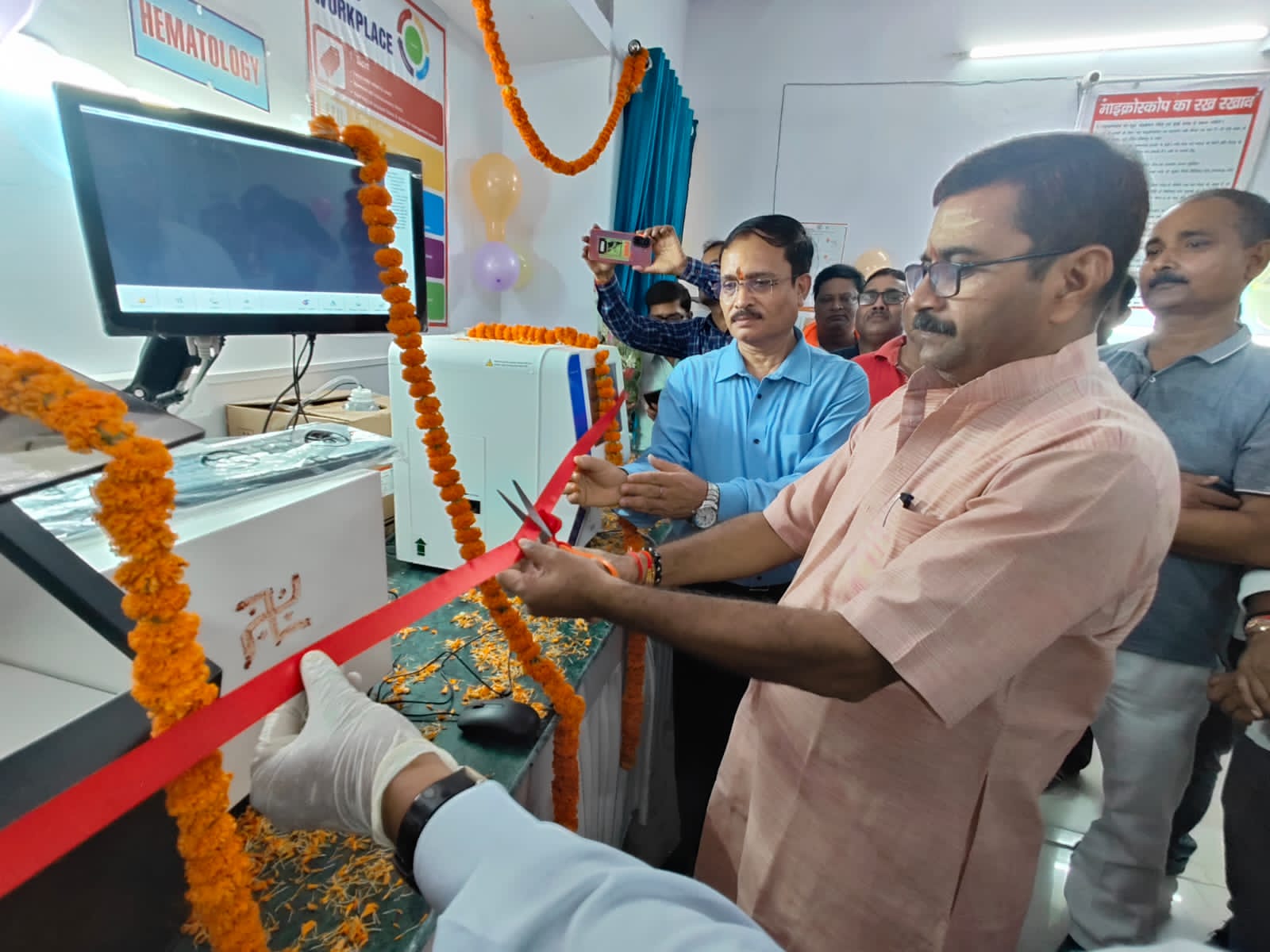 पूर्ण ऑटोमैटिक ब्लड एनालाइजर मशीन का विधायक डा नीलकंठ तिवारी ने किया उद्घाटन।