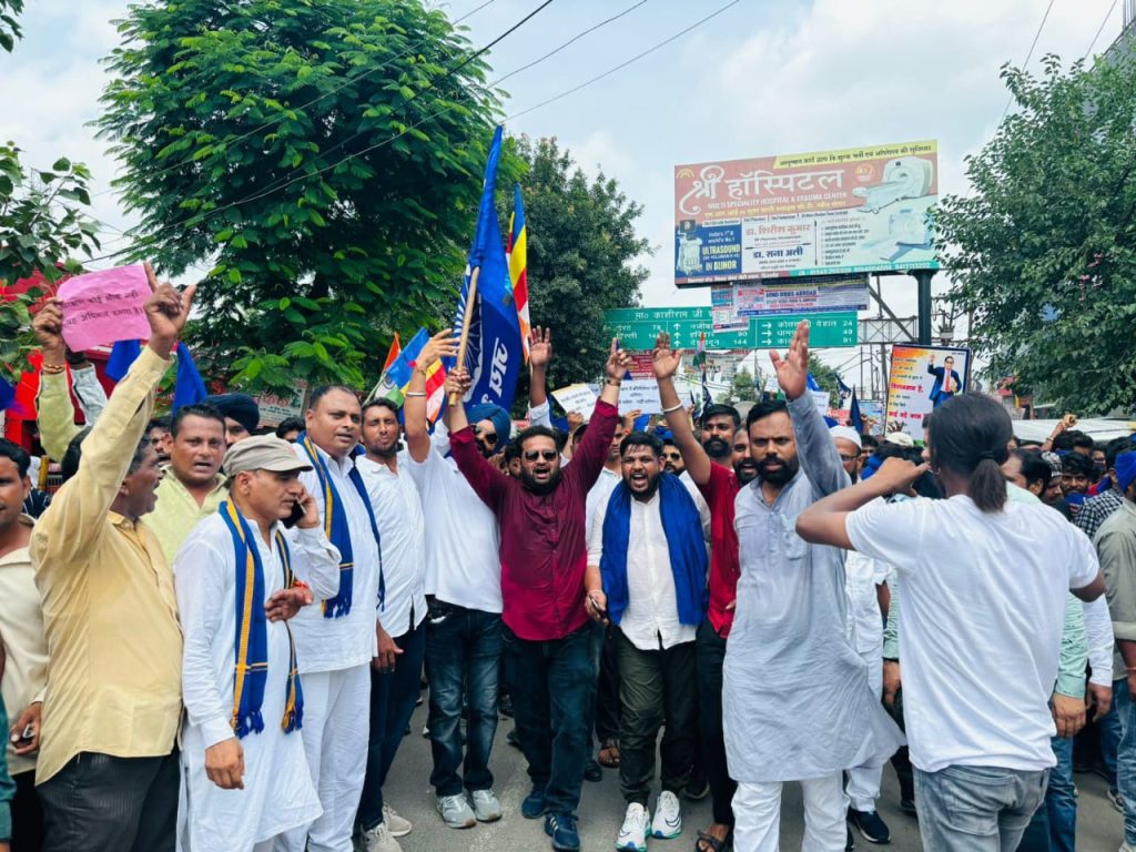 किरतपुर । आजाद समाज पार्टी (भीम आर्मी) के युवा नेता साहिल मेहरा ने विभिन्न राजनीतिक पार्टियों व संगठनों द्वारा आहूत भारत बंद व आरक्षण में वर्गीकरण के विरोध में बिजनौर में किए गए जोरदार प्रदर्शन में अपने समर्थकों में के साथ शिरकत की।
