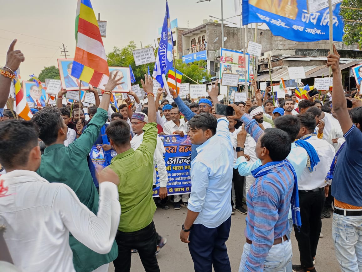 मामला चित्रकूट जनपद के सदर कर्वी की है जहां आभास महासंघ सहित सरदार सेना,भीम आर्मी आजाद समाज पार्टी बीएसपी पार्टी संगठनों द्वारा सुप्रीम कोर्ट के द्वारा दिए गए 1 अगस्त 2024 को एससी/ एसटी आरक्षण में उपवर्गीकरण क्रीमीलेयर कानून विरोध में पुरानी कोतवाली प्रांगण में हजारों की तादाद में उमड़ा जनसैलाब ,जनाक्रोश एवं हुंकार आंदोलन के साथ-साथ किया गया भारत बंद । पूरे शहर कर्वी मार्केट को बंद कराते हुए प्रदर्शनकारियों ने धनुष बाण चौराहा हुआ जाम जय भीम के नारों के साथ आरक्षण कोई भीख नहीं यह संवैधानिक अधिकार हमारा है के नारों से शहर गूंज उठा, वही आंदोलनकारी से और प्रशासन क्रीमी लेयर आरक्षण को लेकर विरोध प्रदर्शन व भारत बंद आंदोलन किया गया इस भारत बंद आंदोलन में एससी एसटी ओबीसी के लोगों ने बढ़ चढ़कर हिस्सा लिया तथा कई दलों ने के नेताओ ने इस भारत बंद आंदोलन का समर्थन किया।