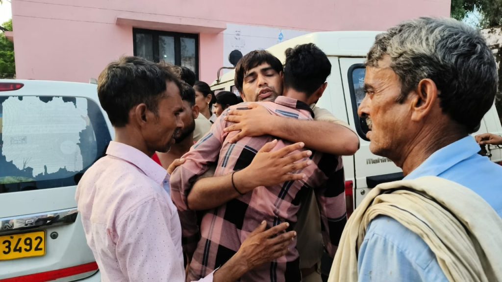 जनपद लखीमपुर के विकास खण्ड बिजुआ के भानपुर में सड़क दुर्घटना में मर्तका के परिजन को गले लगा कर सुअंतना देते सिपाही प्रदीप चीमा पुलिस मित्रता की मिशाल बन गए । महिला की मौत के बाद बिफर गए थे परिजन भीरा पुलिस का मैत्रीपूर्ण व्यवहार बन गया ढाल**बिलखते परिजनों को कई बार गले लगाते नजर आए भीरा थाने पर तैनात जांबाज सिपाही प्रदीप चीमा**बिजुआ कस्बे में बिगड़ते माहौल को गले लगाकर संभाल ले गए प्रदीप चीमा**सिपाही के मित्रवत व्यवहार को जिसने भी देखा हो गया कायल,करने लगा तारीफ**महिला की मौत के बाद आक्रोशित परिजनों ने बिजुआ चौकी के सामने लगा दिया था जाम*