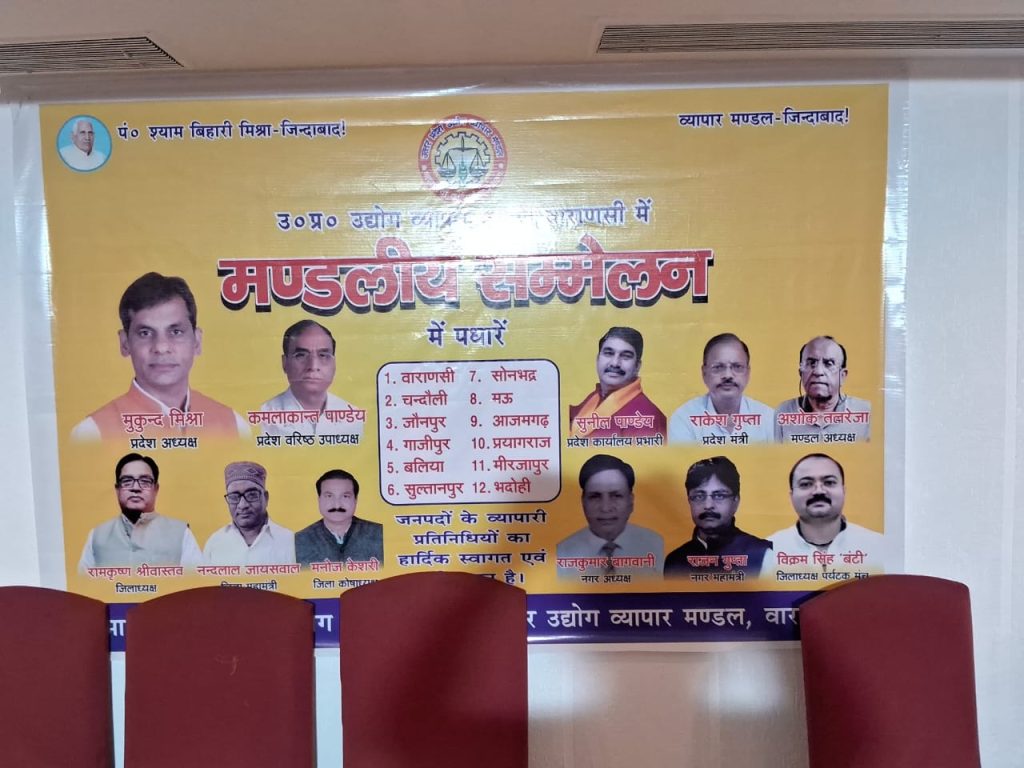 वाराणसी होटल ज्हान्वी वाराणासी मे उत्तर प्रदेश उद्योग व्यापार मंडल वाराणासी मण्डलीय सम्मेलन का आयोजन हुआ जिस मे प्रदेश के सभी जिलों से उद्योग व्यापार मंडल के जिलाध्यक्ष व पदाधिकारी आए कार्यक्रम की अध्यक्षता मुकुल मिश्रा प्रदेश अध्यक्ष , कमलाकांत पांडेय वरिष्ठ उपाध्यक्ष, सूनील पांडेय , राजेश गुप्ता प्रदेश मंत्री, अशोक तबरेज मंडल अध्यक्ष व साधना सिंह सांसद जिला चंदौली ने की जिसमें सभी ने अपने अपनी वक्ताओं मे उद्योग व्यापार मंडल को और मजबूत सशक्तिकरण पर अपनी बात कही और आज कल किसी प्रकार की व्यापारीयों पर धौंस दिखाने वालों पर कार्रवाई होने की बात हुई इसलिए उत्तर प्रदेश के जिलो मे मण्डलीय सम्मेलन आयोजित कर और सशक्त बनाने के लिए किया जारहा है वाराणसी,1. सोनभद्र 2. चन्दौली3. मऊ 4. जौनपुर 5. आजमगढ़ 6. गाजीपुर 7. प्रयागराज 8. बलिया 9. मीरजापुर 10. सुल्तानपुर 11. भदोही और अन्य जिलों से आए सभी उद्योग व व्यापारियों का स्वागतवाराणासी नगर के व्यापारीगण ने किया श्रीकृष्ण श्रीवास्तव जिलाध्यक्ष, नन्दलाल जायसवाल जिला मंत्रीय, मनोज केशरी जिला कोषाध्यक्ष, राजकुमार बागवानी नगर अध्यक्ष, राजन गुप्ता नगर महा मंत्री, विक्रम सिंह ” बंटी ʼ जिलाध्यक्ष पर्यटक मंचन एवं अन्य पदाधिकारी ने सभी का अभिनन्दन किया