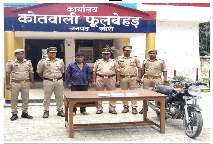 लखीमपुर खीरी। सोमवार को पुलिस अधीक्षक खीरी गणेश प्रसाद शाहा द्वारा चलाए जा रहे वांछित वारंटी अभियुक्तों की गिरफ्तारी अभियान के अनुपालन मे अपर पुलिस अधीक्षक क्षेत्रधिकारी धौराहरा के कुशल नेतृत्व मे मे व प्रभारी निरीक्षक आलोक धीमान के निर्देशन मे थाना फूलबेहड़ पुलिस द्वारा बँधा से गौरा गांव जाने बाले मार्ग से इरसाद पुत्र कल्लू निवासी ग्राम मुमतिया बेहड़ा 45 को मे चोरी के सामान सहित किया गिरफ्तार अभियुक्त के विरुद्ध विधिक कार्यवाही पूर्ण कर पेशी हेतु न्यायलय भेजा गया।