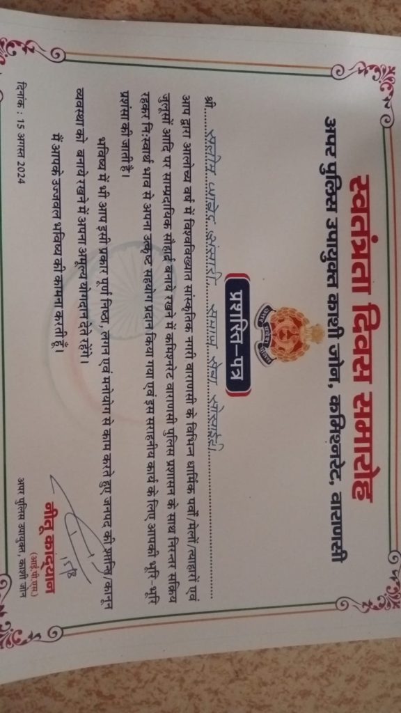 एडीसीपी काशी जोन आईपीएस महोदया नीतू कादयान जी शहर में समय समय पर शांति व्यवस्था त्योहारों को संपन्न कराने में अपना अमूल्य योगदान दिया जिसमे विसेस सामाजिक संस्था समाज सेवा सोसायटी उत्तर प्रदेश जिला वाराणसी कमिश्नरेट एवम अन्य सामाजिक एवम लोगो की उत्साह उर्धन करते हुए कार्यालय पर एडीसीपी महोदया नीतू कादयान काशीजोन द्वारा प्रशस्ति पत्र देकर सम्मानित किया साथ ही भूरी भूरी प्रसनसा करते हुए आगे भी इसी तरह समय समय सहयोग प्रदान करने और समाज को जागरूक करने के लिए प्रेणना दिया