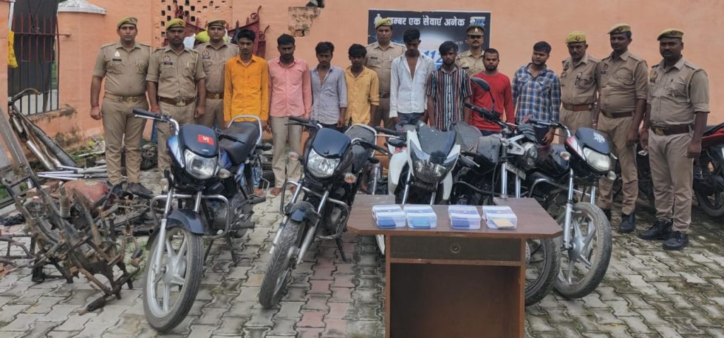 पुलिस अधीक्षक महोदय खीरी, श्री गणेश प्रसाद साहा के निर्देशन व अपर पुलिस अधीक्षक महोदय खीरी के निकट पर्यवेक्षण में सम्पूर्ण जनपद में अपराध की रोकथाम व वांछित अभियुक्तों की गिरफ्तारी हेतु चलाए जा रहे अभियान के अंतर्गत थाना भीरा पुलिस द्वारा लूट, मोटर साइकिल चोरी व अन्य चोरी की घटना मे संलिप्त 08 नफर अभियुक्त गण करन शर्मा, राकेश कुमार उर्फ टन्ने, रमाकान्त, नितेश मिश्रा, अनुपम, शिशिर मण्डल, जेफुद्दीन व दिलशाद उर्फ गुल्लु को विभिन्न घटनाओं में लूटे गये मोबाइल फोन तथा लूट की घटना मे संलिप्त 01 अदद मोटर साइकिल UP 31 AZ 8603, चोरी की 04 मोटर साइकिल तथा चोरी के अन्य सामान के साथ बहृदग्राम गोंधिया से गिरफ्तार किया गया व अभि0गणों के बताये अलग – अलग स्थानों से मोटर साइकिल, पार्ट्स व मोबाइल फोन बरामद किये गये। उपरोक्त बरामदगी व गिरफ्तारी के आधार पर थाना भीरा पर मु0अ0सं0 370/2024 धारा BNS का अभियोग पंजीकृत कर अभियुक्त गणों को माननीय न्यायालय के समक्ष पेश करने हेतु लखीमपुर खीरी भेजा गया।