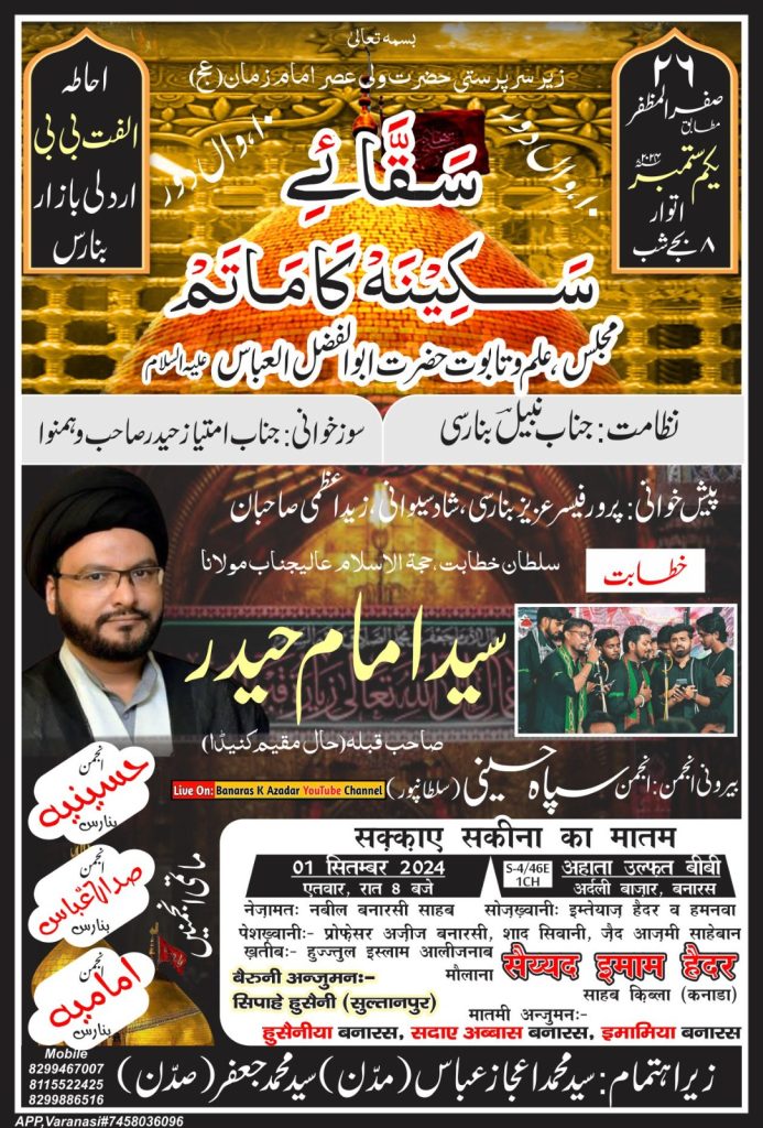 वाराणसी: 2 माह 8 दिन चलने वाले मोहर्रम के सिलसिले से हर साल कि तरह इस साल भी अर्दली बाजार का प्रसिद्ध*सक्का- ए – सकीना का मातम 1 सितंबर रविवार को उलफत बीबी हाता अर्दली बाजार में रात्रि 8 बजे से हाजी एस एम जाफर सद्दन एडवोकेट के आवास पर होगा।
