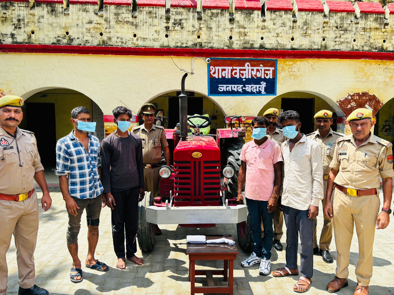 बदायूँ थाना वजीरगंज पुलिस ने एक चोरी हुआ ट्रैक्टर महिंद्रा कंपनी को पंकज कुमार,विक्की कश्यप, प्रदीप, रमेश चंद्र के कब्जे से बरामद किया ट्रैक्टर 5 अगस्त को थाना वजीरगंज क्षेत्र से चोरी किया गया था इसके संबंध में थाना वजीरगंज पर विभिन्न धारा में मुकदमा पंजीकृत किया गया था पकड़े गए आरोपी प्रदीप के कब्जे से एक तमंचा दो कारतूस बरामद हुए इसमें पुलिस ने आर्म्स एक्ट का मुकदमा दर्ज किया पुलिस ने चारों आरोपियों को जेल भेज दिया हैथाना वजीरगंज पुलिस को ट्रैक्टर के साथ पकड़े गए आरोपियों ने बताया कि हम चारों लोग प्रमोद और आशीष के साथ मिलकर बदायूं, बरेली के आसपास के जिलों से वाहनों को चोरी करते हैं यह ट्रैक्टर भी हमने मिलकर कस्बा वजीरगंज बिल्सी रोड से 5 अगस्त की रात्रि को चोरी किया था ट्रैक्टर के साथ रोटावेटर भी था जिसको चारों चोर सिम्भावली जिला हापुड ले गए थे ट्रैक्टर और रोटावेटर को प्रमोद के पास ही छोड़ दिया था आशीष ने ट्रैक्टर की पटियां अपने काम के लिए ले ली थी पुलिस ने आशीष को पहले ही गिरफ्तार कर जेल भेज दिया है चारों आरोपी शनिवार को बरेली ट्रेक्टर बेचने के लिए बरेली जा रहे थे तभी पुलिस ने चारों चोरों को पकड़ लिया। पुलिस ने चोरों के खिलाफ विधिक कार्रवाई करने के बाद जेल भेज दिया है।