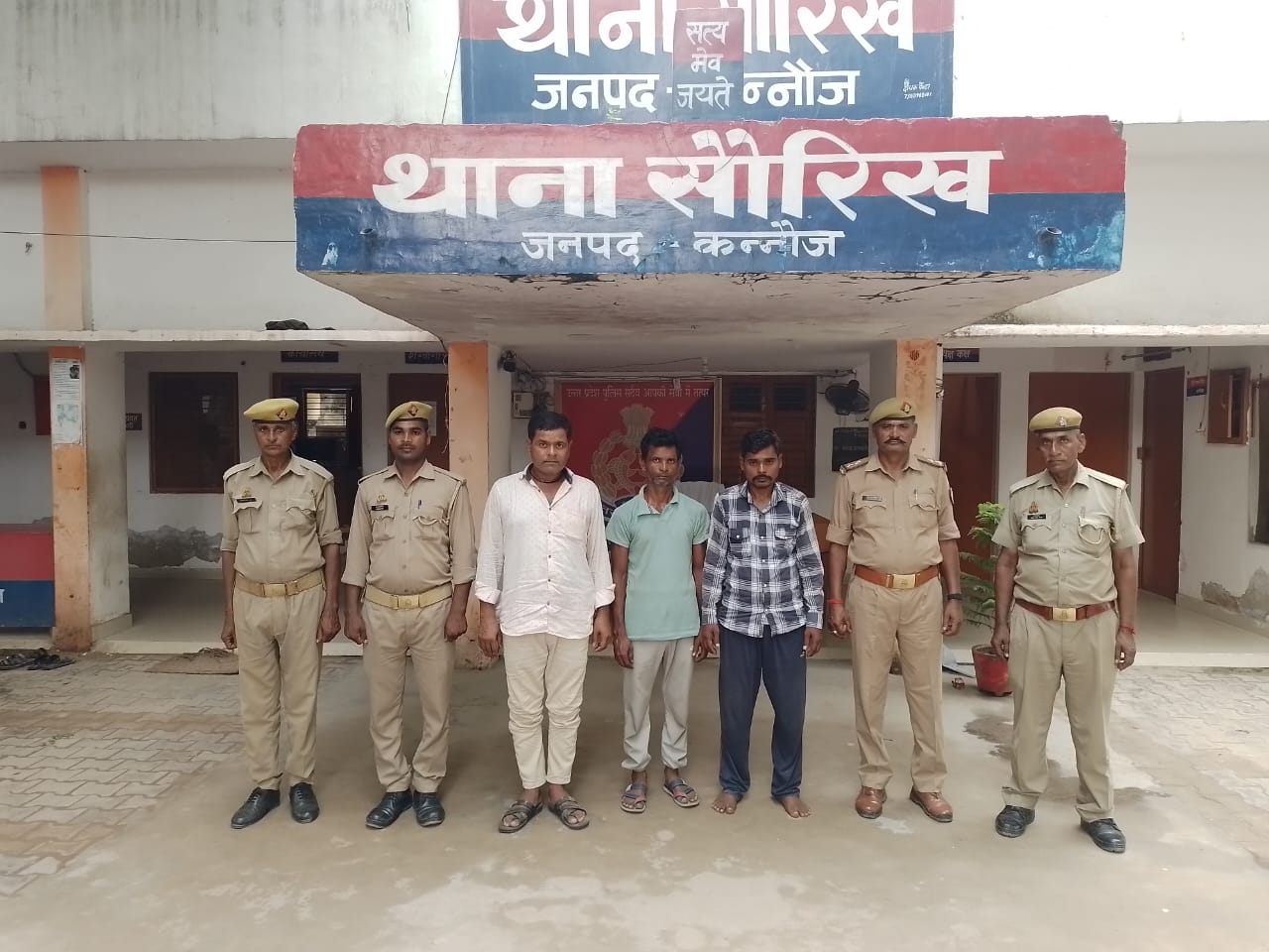 दिनांक 01.09.2024 को थाना सौरिख पुलिस द्वारा जरिये मुखबिर खास सूचना प्राप्त हुयी कि दिनांक 29.08.24 को जो ई-रिक्शा कस्बे से चोरी हुआ था उसे चोरी करने वाले चोर ई-रिक्शा को लेकर राजापुर बम्बे पर खडे हुये है तथा कही ले जाने की फिराक मे है । उक्त सूचना पर राजापुर बम्बा पर पहुचे तो तीन व्यक्ति लाल व हरे रंग का ई-रिक्शा को लेकर जा रहे है ,उपरोक्त ई-रिक्शा व अभि0गण को घेर कर पकड़ लिया । उनसे नाम पता पूछा गया तो उन्होने अपना नाम 1.रमाकान्त पुत्र प्रभुदयाल उम्र करीब 36 वर्ष निवासी ग्राम कायमपुर थाना सौरिख जनपद कन्नौज 2.हरगोविन्द पुत्र श्री शेरबहादुर सिंह उम्र करीब 42 वर्ष निवासी ग्राम आरिफपुर थाना सकरावा जनपद कन्नौज 3.राजकुमार पुत्र सुभाषचन्द्र उम्र करीब 45 वर्ष निवासी ग्राम कायमपुर थाना सौरिख जनपद कन्नौज बताया जो कि मु0अ0सं0 381/2024 धारा 303(2) / 317(2)BNS से सम्बन्धित है । अभि0गण को गिरफ्तार कर विधिक कार्यवाही पूर्ण करते हुए मा0न्या0 भेजा गया।