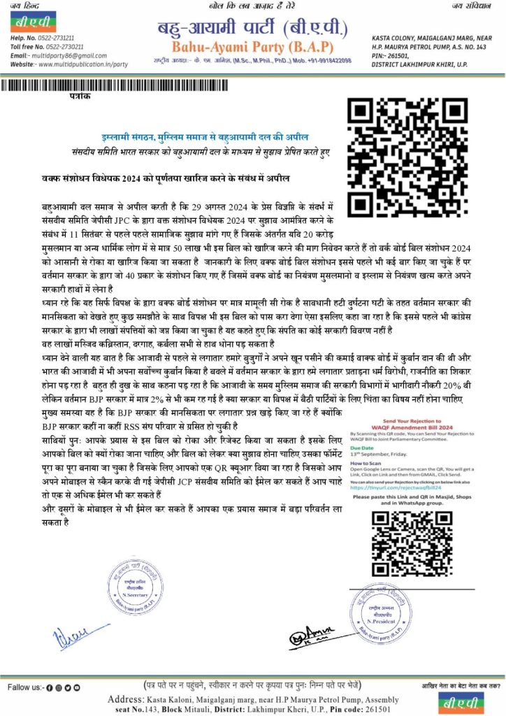 बहुआयामी दल समाज से अपील करती है कि 29 अगस्त 2024 के प्रेस विज्ञप्ति के संदर्भ में संसदीय समिति जेपीसी JPC के द्वारा वक्त संशोधन विधेयक 2024 पर सुझाव आमंत्रित करने के संबंध में 11 सितंबर से पहले पहले सामाजिक सुझाव मांगे गए हैं जिसके अंतर्गत यदि 20 करोड़ मुसलमान या अन्य धार्मिक लोग में से मात्र 50 लाख भी इस बिल को खारिज करने की माग निवेदन करते हैं तो वर्क बोर्ड बिल संशोधन 2024 को आसानी से रोका या खारिज किया जा सकता है जानकारी के लिए वक्फ बोर्ड बिल संशोधन इससे पहले भी कई बार किए जा चुके हैं पर वर्तमान सरकार के द्वारा जो 40 प्रकार के संशोधन किए गए हैं जिसमें वक्फ बोर्ड का नियंत्रण मुसलमानो व इस्लाम से नियंत्रण खत्म करते अपने सरकारी हाथों में लेना है ध्यान रहे कि यह सिर्फ विपक्ष के द्वारा वक्फ बोर्ड संशोधन पर मात्र मामूली सी रोक है सावधानी हटी दुर्घटना घटी के तहत वर्तमान सरकार की मानसिकता को देखते हुए कुछ समझौते के साथ विपक्ष भी इस बिल को पास करा देगा ऐसा इसलिए कहा जा रहा है कि इससे पहले भी कांग्रेस सरकार के द्वारा भी लाखों संपत्तियों को जप्त किया जा चुका है यह कहते हुए कि संपति का कोई सरकारी विवरण नहीं है वह लाखों मस्जिद कब्रिस्तान, दरगाह, कर्बला सभी से हाथ धोना पड़ सकता हैध्यान देने वाली यह बात है कि आजादी से पहले से लगातार हमारे बुजुर्गों ने अपने खून पसीने की कमाई वाक्फ बोर्ड में कुर्बान दान की थी और भारत की आजादी में भी अपना सर्वोच्च कुर्बान किया है बदले में वर्तमान सरकार के द्वारा हमे लगातार प्रताड़ना धर्म विरोधी, राजनीति का शिकार होना पड़ रहा है बहुत ही दुख के साथ कहना पड़ रहा है कि आजादी के समय मुस्लिम समाज की सरकारी विभागों में भागीदारी नौकरी 20% थी लेकिन वर्तमान BJP सरकार में मात्र 2% से भी कम रह गई है क्या सरकार या विपक्ष में बैठी पार्टियों के लिए चिंता का विषय नहीं होना चाहिए मुख्य समस्या यह है कि BJP सरकार की मानसिकता पर लगातार प्रश्न खड़े किए जा रहे हैं BJP सरकार कहीं ना कहीं RSS संघ परिवार से ग्रसित हो चुकी है साथियों पुनः आपके प्रयास से इस बिल को रोका और रिजेक्ट किया जा सकता है इसके लिए आपको बिल को क्यों रोका जाना चाहिए और बिल को लेकर क्या सुझाव होना चाहिए उसका फॉर्मेट 13 September, Friday पूरा का पूरा बनाया जा चुका है जिसके लिए आपको एक QR क्यूआर दिया जा रहा है जिसको आप अपने मोबाइल से स्कैन करके दी गई जेपीसी JCP संसदीय समिति को ईमेल कर सकते हैं आप चाहे तो एक से अधिक ईमेल भी कर सकते हैं क्यौकी और दूसरों के मोबाइल से भी ईमेल कर सकते हैं आपका एक प्रयास समाज में बड़ा परिवर्तन ला सकता है