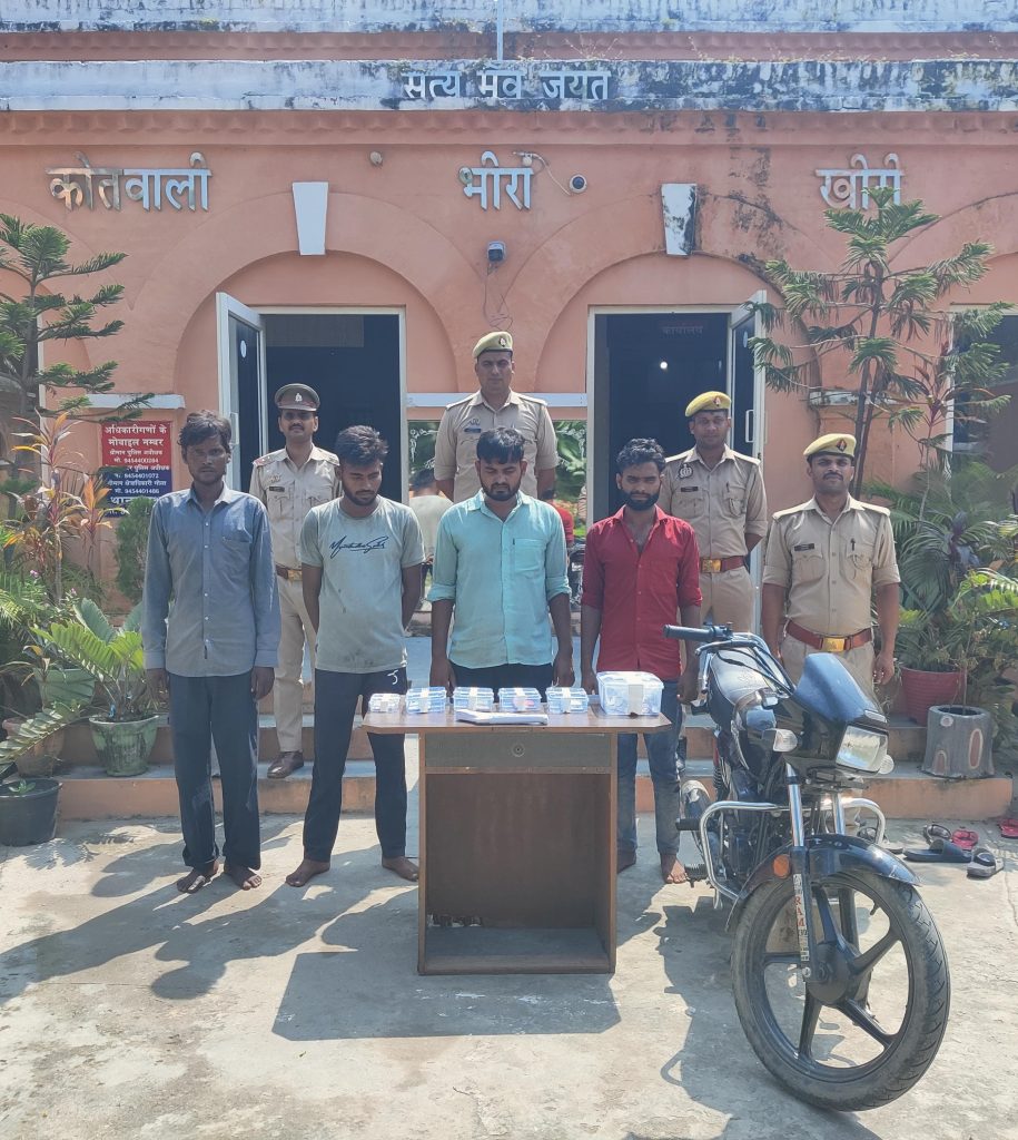 पुलिस अधीक्षक जनपद लखीमपुर खीरी एवं अपर पुलिस अधीक्षक पश्चिमी के कुशल निर्देशन एवं श् क्षेत्राधिकारी महोदय गोला के पर्यवेक्षण में व प्रभारी निरीक्षक भीरा के नेतृत्व में जनपद खीरी मे अपराधियों के विरूद्ध चलाये जा रहे अभियान के तहत लूट की घटना(छीनैती) व चोरी की घटना मे संलिप्त 04 नफर अभियुक्त गण 1. अभिषेक पुत्र महेश प्रसाद उम्र करीब 22 वर्ष 2. अभिनन्दन पुत्र विजयपाल उम्र करीब 23 वर्ष नि0गण भैठिया थाना गोला जनपद खीरी 3. छत्रपाल पुत्र नत्थूलाल उम्र करीब 32 वर्ष नि0ग्राम पडरिया तिलकापुर थाना भीरा जनपद खीरी 4. विकास पुत्र गया प्रसाद उम्र करीब 20 वर्ष नि0ग्राम भैठिया थाना गोला जनपद खीरी को 1. मु0अ0सं0 388/24 धारा 304(2) BNS से सम्बन्धित छीने किये गये एक अदद मोबाइल फोन टच रियलमी कम्पनी का तथा छीनैती की घटना मे संलिप्त 01 अदद मोटर साइकिल UP 31 CC 4396, 2. मु0अ0स0 385/24 धारा 305 BNS से सम्बन्धित कस्बा भीरा मे दुकान से चोरी किये गये 1998 रूपये ( 02 रुपये के 671 सिक्के, 01 रुपये के 156 सिक्के व 10 रुपये के 50 नोट कुल 1998 रुपये ) व थाना शारदानगर मे पंजीकृत मु0अ0सं0 153/2024 धारा 380 भादवि से सम्बन्धित चोरी किये गये 2410 रूपये व अभि0गणों द्वारा भिन्न क्षेत्र से छीने गये 03 अदद मोबाइल फोन 1. विवो टच मोबाइल फोन, 2. सैमसंग टच मोबाइल फोन, 3. रेडमी टच मोबाइल फोन व अभियुक्त अभिषेक उपरोक्त के कब्जे से 01 अदद देशी तमंचा 12 मय 01 अदद जिन्दा कारतूस 12 बोर के साथ भीरा नहर पुलिया से आगे महेशापुर की ओर बहदग्राम भीरा से गिरफ्तार किया गया फर्द बरामदगी व गिरफ्तारी के आधार पर थाना स्थानीय पर मु0अ0सं0 385/2024 धारा 304(2)/305/317(2)/317(4) BNS व 3/25 आर्म्स एक्ट का अभियोग पंजीकृत कर अभियुक्त गणों को माननीय न्यायालय के समक्ष पेश करने हेतु लखीमपुर खीरी भेजा गया ।