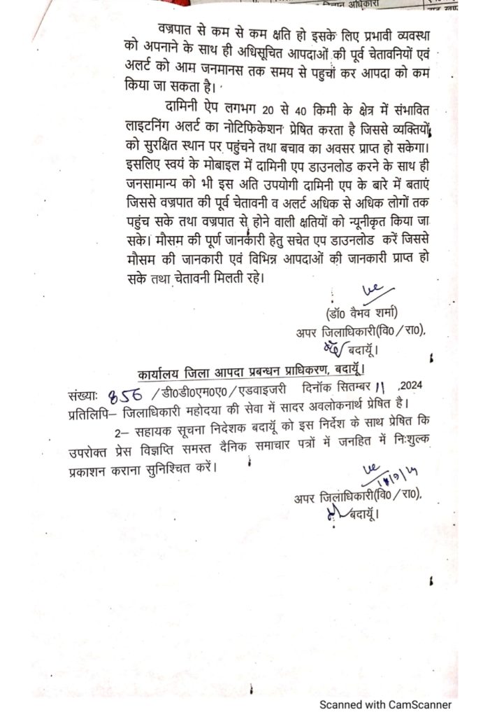 बदायूं/उत्तर प्रदेश : वज्रपात से बचाव को लेकर जिला आपदा प्रबंधन प्राधिकरण द्वारा एडवाइजरी जारी । मौसम विभाग द्वारा पूर्वानुमान के अनुसार दिनांक 12/09 /2024 एवम् 14/09/2024 को भारी वर्षा और वज्रपात होने की चेतावनी (यैलो अलर्ट) जारी ।