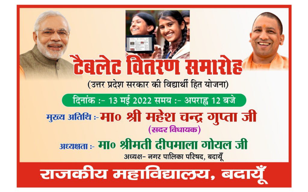 राजकीय महाविद्यालय बदायूं में पंजीकृत एमए व एम कॉम द्वितीय वर्ष के छात्र छात्राओं को कल दिनांक 13 मई 2022 को मुख्य अतिथि सदर विधायक महेश चंद गुप्ता,उच्च शिक्षा की जिला नोडल अधिकारी डॉ स्मिता जैन एवं जिला प्रशासन के अन्य अपेक्षित अधिकारियों की उपस्थिति में उत्तर प्रदेश सरकार द्वारा प्रदत्त टैबलेट वितरित किया जाएगा। समारोह की अध्यक्षता बदायूं नगर पालिका की अध्यक्ष दीपमाला गोयल करेंगी।