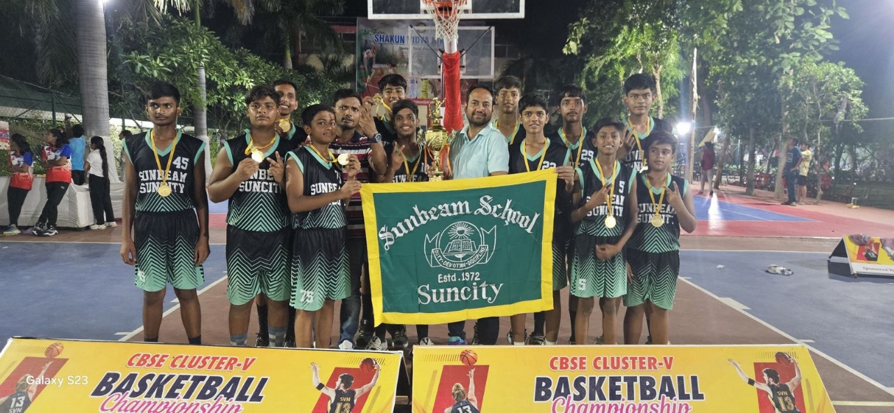 सीबीएसई क्लस्टर-V बास्केटबॉल चैंपियनशिप 2024: सनबीम सनसिटी अंडर 14 टीम ने जीता चैंपियनशिप ट्रॉफी।