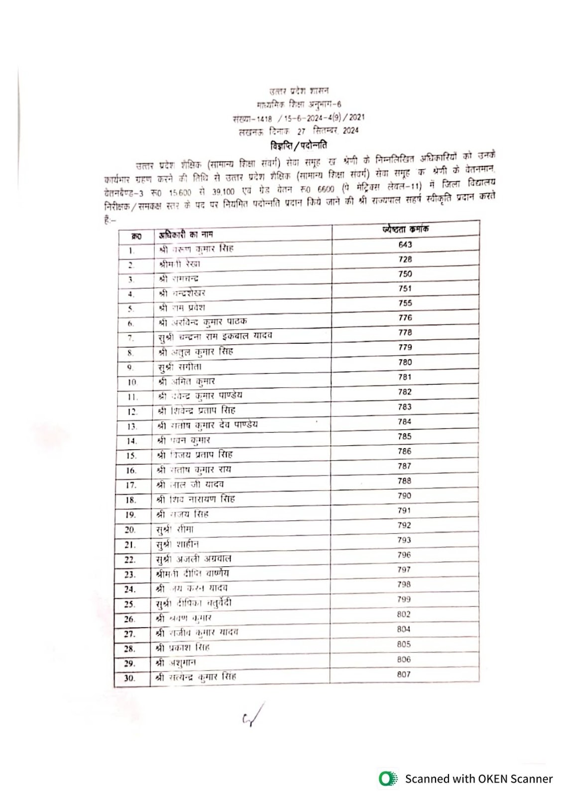 माध्यमिक शिक्षा विभाग की ओर से जारी आदेश के अनुसार समूह क श्रेणी के अधिकारियों की वेतन बैंड 15600-39100 व ग्रेड वेतन 6600 में डीआईओएस व समकक्ष स्तर के पद पर नियमित पदोन्नति दी गई है। इसमें लखनऊ के बीएसए राम प्रवेश, रायबरेली के शिवेंद्र प्रताप सिंह, बाराबंकी के संतोष कुमार देव पांडेय, अयोध्या के संतोष कुमार राय, गोंडा के प्रभारी डीआईओएस रामचंद्र, हरदोई के विजय प्रताप सिंह, प्रयागराज के बीएसए प्रवीण कुमार तिवारी, अंबेडकर नगर के भोलेंद्र प्रताप सिंह आदि शामिल हैं।