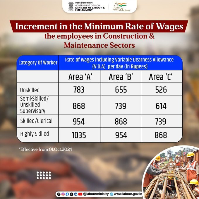 संशोधन के पश्चात क्षेत्र ‘ए’ में निर्माण, झाड़ू, सफाई, लोडिंग व अनलोडिंग में कार्यरत अकुशल श्रमिकों के लिए न्यूनतम मजदूरी दर 783 रुपये प्रतिदिन (20,358 रुपये प्रतिमाह) अर्द्धकुशल के लिए 868 रुपये प्रतिदिन (22,568 रुपये प्रतिमाह) कुशल, लिपिक और शस्त्र रहित चौकीदार के लिए 954 रुपये प्रतिदिन (24,804 रुपये प्रतिमाह) तथा उच्च कुशल एवं शस्त्र सहित चौकीदार के लिए 1,035 रुपये प्रतिदिन (26,910 रुपये प्रतिमाह) होगी।केन्द्र सरकार औद्योगिक श्रमिकों के लिए उपभोक्ता मूल्य सूचकांक में छह माह की औसत वृद्धि के आधार पर, वर्ष में दो बार, 1 अप्रैल और 1 अक्टूबर से, वीडीए में संशोधन करती है।