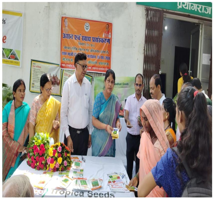 प्रयागराज।जनपद प्रयागराज में एकीकृत बागवानी विकास मिशन योजनान्तर्गत संकर शाकभाजी बीज वितरण मेला कार्यक्रम का आयोजन अधीक्षक राजकीय उद्यान प्रयागराज के कार्यालय परिसर में दिनांक 29.09.2024 को सम्पन्नित हुआ। इस बीज वितरण मेला कार्यक्रम का शुभारम्भ मुख्य अतिथि श्रीमती कविता पटेल जिलाध्यक्ष भाजपा गंगापार द्वारा किया गया। इस अवसर पर श्रीमती कविता पटेल द्वारा कृषकों को फूलगोभी, पातगोभी, मसाला मिर्च, टमाटर, लौकी, तरोई तथा खीरा के संकर बीजों का वितरण भी किया गया इस बीज वितरण मेले में जनपद के विभिन्न विकास खण्डो से लगभग 300 किसानो द्वारा प्रतिभाग किया गया तथा समस्त औपचारिकताओं पूर्ण करने के पश्चात कृषकों को विभिन्न फसलों के संकर बीज भी वितरित किये गये इस अवसर पर जिला उद्यान अधिकारी प्रयागराज श्री उमेश चन्द्र उत्तम ने उद्यान एवं खाद्य प्रसंस्करण विभाग द्वारा संचालित योजनाओं जैसे – एकीकृत बागवानी विकास मिशन, प्रधानमंत्री कृषि सिंचाई योजना, प्रधानमंत्री सूक्ष्म खाद्य उद्योग उन्नयन योजना आदि के बारे में किसानों को विस्तार से बताया।