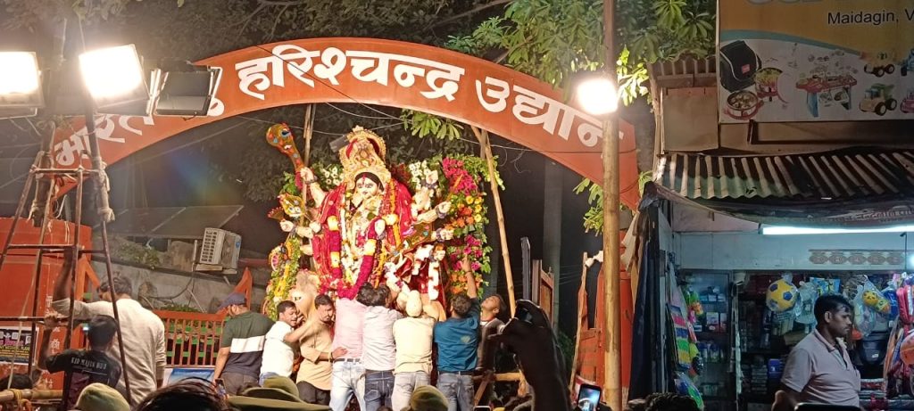 क्लब के होने वाले मां आदिशक्ति की प्रतिमा के विसर्जन को लेकर 200 से अधिक अतिरिक्त पुलिस के जवानों की तैनाती की गई। एवम अन्य अधिकारी मौजूद रहे मुस्लिम बहुमूल्य क्षेत्र से सुरक्षा के बीच निकली माता की प्रतिमामाता की 15 फीट ऊंची मूर्ति 5 फीट चौड़े गली से निकली इस दौरान गली में पुलिस की मुस्तैदी देखने को मिली। वाराणसी काशी जोन के डीसीपी गौरव बंसवाल ने बताया कि गोल्डन स्पोर्टिंग क्लब की मूर्ति का विसर्जन मुस्लिम बाहुल्य क्षेत्र से होकर जाता है। अतिरिक्त पुलिस के जवानों की तैनाती की गई है और शांतिपूर्ण तरीके से मैदागिन मंदा किनी कुंड में मूर्ति का विसर्जन कराया गया।
