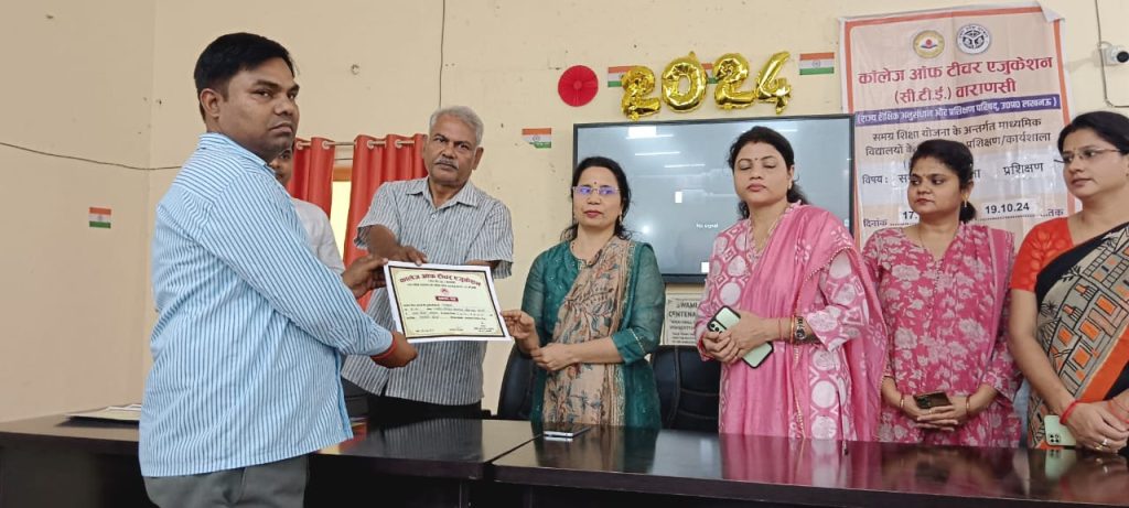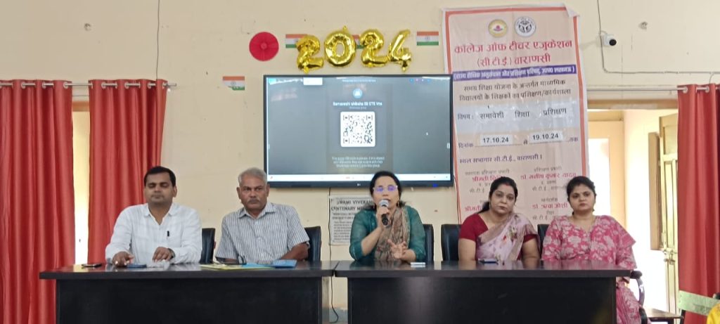वाराणसी महानिदेशक समग्र शिक्षा,उत्तर प्रदेश, लखनऊ के आदेश अनुपालन में प्राचार्य, कॉलेज आफ टीचर एजुकेशन, वाराणसी के संरक्षण में माध्यमिक शिक्षा के अध्यापकों हेतु समावेशी शिक्षा आधारित प्रशिक्षण दिनांक 14.10.2024 से 19 10 2024 के मध्य आयोजित कराया गया, जिसमें वाराणसी, गोरखपुर, देवीपाटन एवं बस्ती मंडलों से माध्यमिक शिक्षकों द्वारा प्रशिक्षण में प्रतिभाग किया गया।