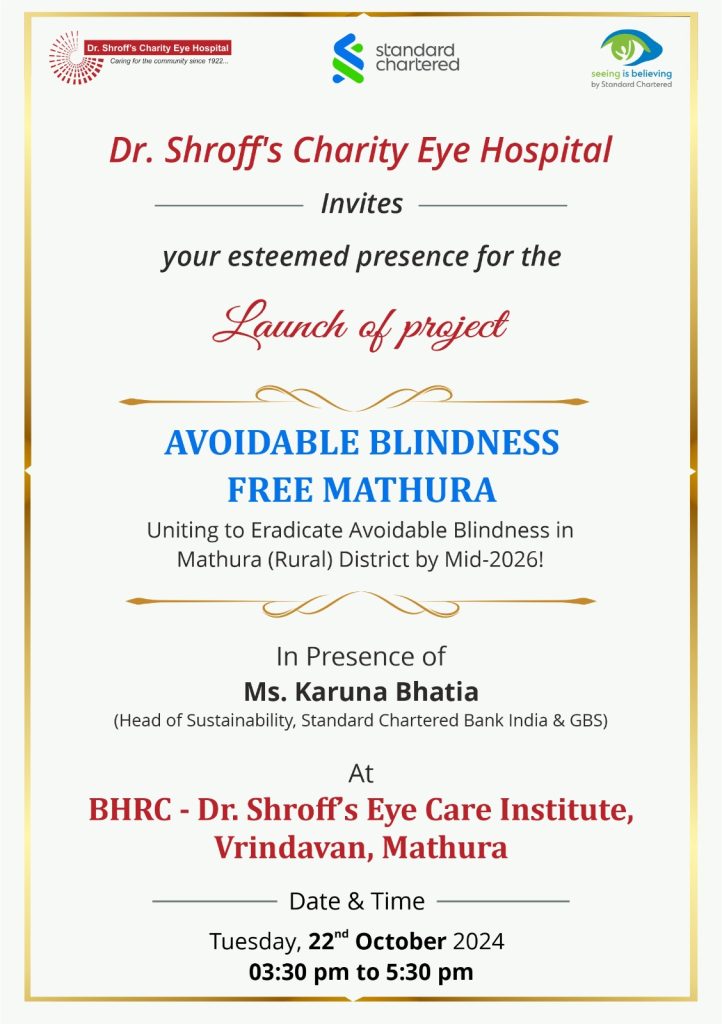 वृंदावन स्तिथि बीएचआरसी- डॉ. श्रॉफ आई इंस्टीट्यूट स्टैंडर्ड चार्टर्ड बैंक के साथ मिलकर जनपद के 10 ब्लॉक के सभी गाँवों को बर्ष 2026 तक अंधता मुक्त करने की परियोजना की शुरुआत की है जिसका शुभारंभ दिनांक 22 अक्टूबर को जिलाधिकारी, मुख्य चिकित्साधिकारी, मुख्य विकास अधिकारी, वरिष्ठ पुलिस अधीक्षक करेंगे।