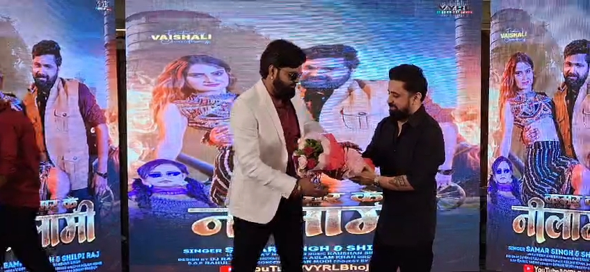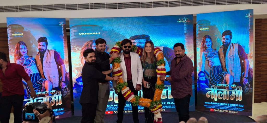 वाराणसी :- देसी स्टार समर सिंह जब भी कोई गाना कमर पर लेकर आते हैं तो वह सुपर डुपर हिट होने के साथ ही साथ वायरल भी हो जाता है विगत कई सालों से समर सिंह का कमर वाला गाना तहलका मचाया हुआ है ऐसे में बाबा विश्वनाथ की नगरी वाराणसी में समर सिंह और शिल्पी राज का गाया हुआ भोजपुरी सांग ‘कमर के नीलामी’ का ग्रांड म्यूजिक लॉन्च एक फाइव स्टार होटल में ‘वायरल भोजपुरी’ म्यूजिक कंपनी ने किया है | इस अवसर पर म्यूजिक कंपनी वायरल भोजपुरी के हेड विक्रांत नेगी,हितेश,देसी स्टार समर सिंह,एक्ट्रेस वैशाली चौधरी, अभय पांडेय, सिंगर मनोज लाल यादव,एस के आनंद,अंकित मिश्रा, गीतकार आलोक यादव सहित तमाम दिग्गज हस्तियां मौजूद रहीं |
