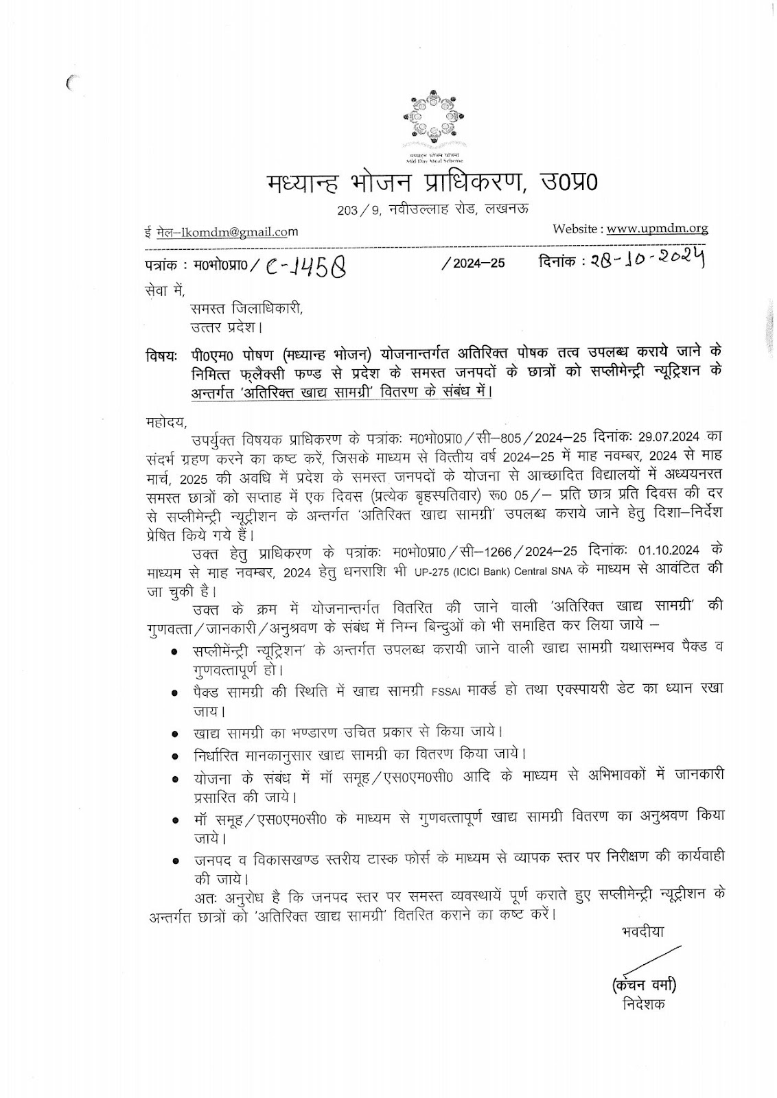 मध्याह्न भोजन प्राधिकरण की निदेशक कंचन वर्मा की ओर से सभी जिलाधिकारियों को निर्देश दिए गए हैं कि अतिरिक्त पोषाहार के वितरण में पर्याप्त सावधानी बरती जाए। खाद्य सामग्री का भंडारण उचित प्रकार से किया जाए, निर्धारित मानक के अनुसार खाद्य सामग्री का वितरण किया जाएगा, मां समूहों व विद्यालय प्रबंधन समिति को इसके माध्यम से जानकारी दी जाए। जिला व ब्लाक स्तरीय टास्क फोर्स का गठन कर इसके वितरण का व्यापक निरीक्षण किया जाए। पांच रुपये प्रति छात्र की दर से विद्यालयों को इस अतिरिक्त पोषाहार के वितरण के लिए धनराशि भी दी गई है। पीएम पोषण योजना के तहत विद्यार्थियों का बेहतर स्वास्थ्य बनाने के लिए उन्हें पोषण की यह अतिरिक्त डोज दी जाएगी। फिलहाल अब साप्ताहिक मेन्यू में हर गुरुवार को उन्हें भोजन के साथ-साथ यह अतिरिक्त पोषाहार दिया जाएगा।