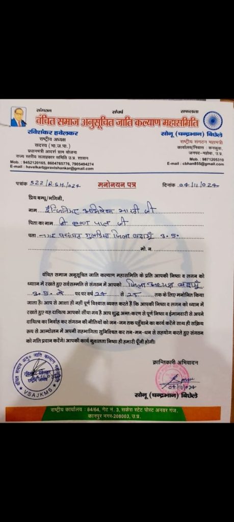 वंचित समाज अनुसूचित जाति कल्याण महासमिति के राष्ट्रीय अध्यक्ष मा. रविशंकर हवेलकर जी /सदस्य राज्य सलहाकार समिति उत्तर प्रदेश शासन द्वारा अभिषेक भारती की समाज के प्रति मेहनत और लगन को देखते हुए बदायूँ जिले का जिलाध्यक्ष मनोनित किया गया है।
