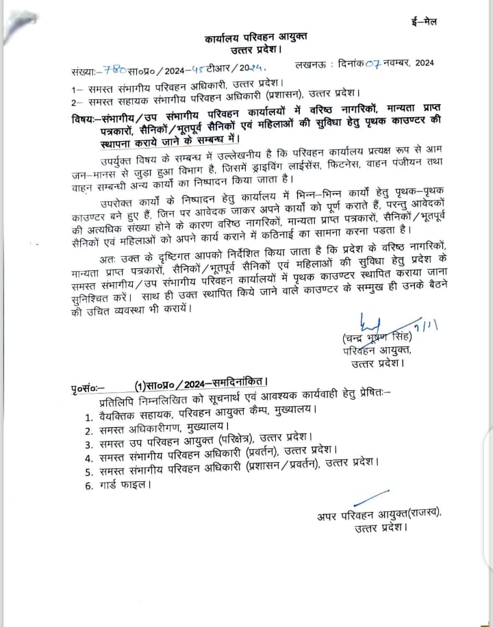 लखनऊ, 7 नवम्बर, 2024: उत्तर प्रदेश के परिवहन आयुक्त कार्यालय द्वारा वरिष्ठ नागरिकों, मान्यता प्राप्त पत्रकारों, सैनिकों/भूतपूर्व सैनिकों और महिलाओं की सुविधा के लिए प्रदेश के सभी संभागीय और उप-संभागीय परिवहन कार्यालयों में विशेष काउंटर स्थापित करने का निर्णय लिया गया है। इस निर्देश का उद्देश्य है कि इन समूहों के लोगों को परिवहन कार्यालय में अपने कार्यों को सहज और सुगम तरीके से पूरा करने में सहूलियत मिल सके।परिवहन आयुक्त चन्द्र भूषण सिंह द्वारा जारी इस आदेश में कहा गया है कि परिवहन कार्यालय में ड्राइविंग लाइसेंस, फिटनेस, वाहन पंजीयन और अन्य आवश्यक कार्यों के लिए विभिन्न काउंटर पहले से ही बने हुए हैं, लेकिन बड़ी संख्या में आवेदकों के आने से वरिष्ठ नागरिकों, पत्रकारों, सैनिकों और महिलाओं को कठिनाइयों का सामना करना पड़ता है। इन सुविधाओं को ध्यान में रखते हुए अब अलग काउंटर स्थापित करने का निर्देश दिया गया है ताकि ये वर्ग बिना किसी बाधा के अपने कार्य समय से पूरा कर सकें।आयुक्त ने निर्देश दिया कि प्रत्येक कार्यालय में इन काउंटरों के सामने बैठने की समुचित व्यवस्था भी सुनिश्चित की जाए, जिससे संबंधित आवेदकों को आरामदायक वातावरण मिले। इन नई व्यवस्थाओं से न केवल आवेदकों की सुविधा बढ़ेगी, बल्कि कार्यालय की कार्यप्रणाली में भी सुधार होगा।