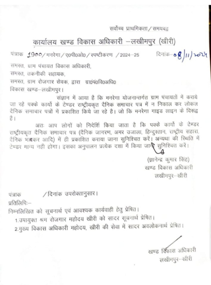 ग्राम विकास अधिकारियों के नाम जारी एक पत्र से निर्देशित किया गया है और नाम चीन अखबारों में ही टेंडर छापें जाएंगे जिससे अन्य दैनिक अखबार के संपादकों ने कड़ी नाराजगी जाहिर की है।
