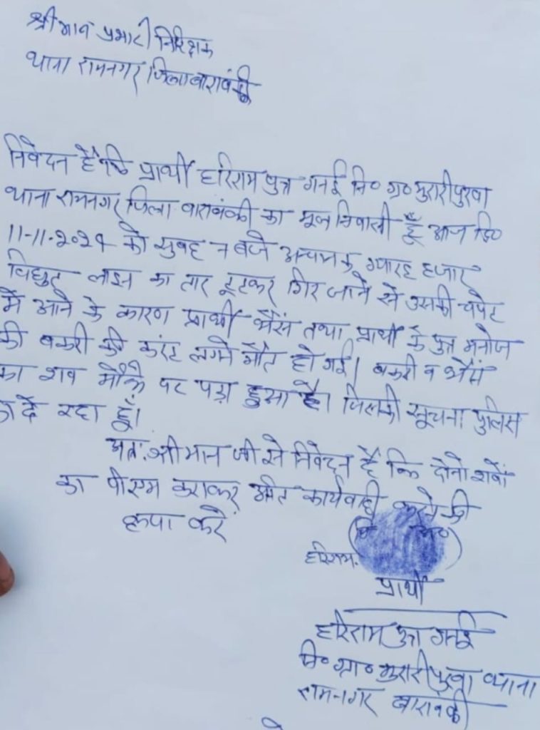 जानकारी के मुताबिक थाना रामनगर क्षेत्र के मुरारी पुरवा मजरे कजियापुर निवासी हरिराम पुत्र गनई की भैंस व उसके पुत्र मनोज कुमार की बकरी करंट की चपेट में आ गई।