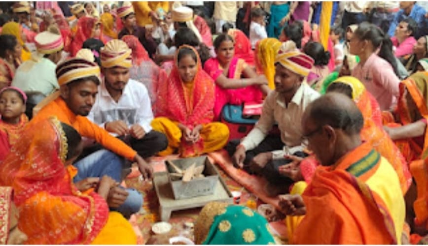 फतेहपुर बाराबंकी। समाज कल्याण विभाग द्वारा संचालित मुख्यमंत्री सामूहिक विवाह योजना के अंतर्गत वैवाहिक कार्यक्रम राजकीय इंटर कॉलेज टिकैतगंज, निन्दूंरा बाराबंकी में बुधवार को आयोजित किया गया जिसमे कुल 58 जोड़ों का सामूहिक विवाह जो गायत्री परिवार शक्तिपीठ टिकैतगंज द्वारा वैदिक मंत्रोचारण से विधिवत कराया गया उसमें एक मुस्लिम जोड़ा भी शामिल रहा। उपरोक्त कार्यक्रम के मुख्य अतिथि क्षेत्रीय विधायक साकेन्द्र प्रताप रहे। निर्धारित समय सुबह 10 बजे शुरू हुए आयोजन कार्यक्रम का शुभारंभ फतेहपुर उपजिलाधिकारी राजेश कुमार विश्वकर्मा ने द्वीप प्रज्वलित करके किया उनके साथ जिला समाज कल्याण अधिकारी सुषमा वर्मा मौजूद रही। उपरोक्त सामुहिक विवाह में वधु को आवश्यक उपहार स्वरुप आभूषण बर्तन, बक्सा, बैग, कूकर आदि सामान दिया गया। इस दौरान कुर्सी थाना प्रभारी गजेंद्र प्रताप सिंह की तरफ से सभी 58 जोड़ों को हाथ की घड़ी भेंट कर आशीर्वाद दिया, परिजनों ने वर-वधु पर पुष्प अक्षत डाले साथ ही फोटो सेल्फी लेते नजर आए, प्रत्येक हवन कुंड पर तीन से चार जोड़े रहे। साथ में आए लोगों ने विवाह का खूब आनंद लिया। कार्यक्रम में विकास खंड निन्दूरा अधिकारी आलोक कुमार वर्मा, बीडीओ फतेहपुर संतोष कुमार, डीडीसी पूनम कन्नौजिया,भाजपा कार्यकर्ता शीलरतन मिहिर, मंडल अध्यक्ष विनय मौर्या, विशाल सिंह, मुकेश सिंह उपस्थित रहे।