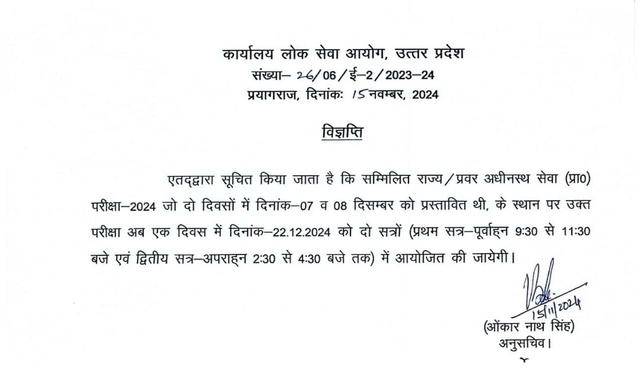 यूपीपीसीएस – 2024 की परीक्षा जो दो दिवसों में दिनांक 7 व 8 दिसंबर को प्रस्तावित थी,के स्थान पर परीक्षा अब एक ही दिन में दिनांक 22 दिसंबर 2024 को दो सत्रों में होगी आयोजित।
