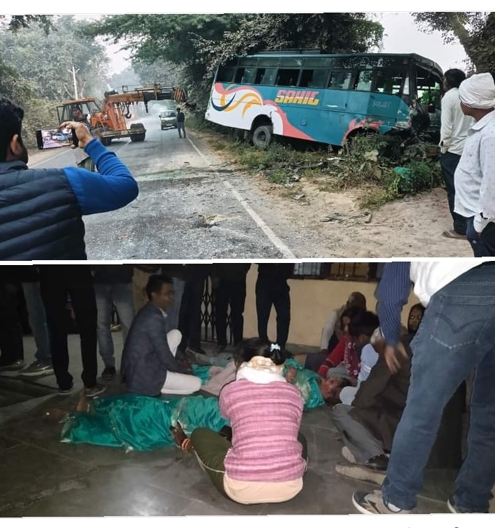 हरदोई में भीषण सड़क हादसा हुआ है, जिसमें 5 बारातियों की मौत हुई है और 4 बुरी तरह घायल हुए हैं। बताया गया बोलेरो व बस की आमने सामने टक्कर हुई। यह हादसा कटरा बिल्हौर मार्ग पर हुआ है। पुलिस ने मृतकों के शव को पोस्टमॉर्टम के लिए भिजवाया है। वहीं चार घायल को लखनऊ के ट्रामा सेंटर रेफर किया गया है।मल्लावां कोतवाली क्षेत्र के गौरी चौराहे के पास बोलेरो कार और बस की भीषण भिड़ंत हुई है। जानकारी के अनुसार, कानपुर से बारात में शामिल होकर लोग बोलेरो से आ रहे थे, इधर बघौली से बारात में शामिल होकर लोग बस से आ रहे थे, कटरा बिल्हौर हाईवे पर मल्लावां कोतवाली क्षेत्र के गौरी चौराहे पर सुबह करीब 3 बजे ये हादसा हो गया। घटनास्थल पर पुलिस ने राहत बचाव कर बोलेरो में दबे लोगों को बाहर निकाला है। घायलों को लखनऊ रेफर किया गया है। सभी मृतक एक शादी समारोह में होकर लौट रहे थे। मृतकों में सीमा देवी 40 पत्नी दयाराम, प्रतिमा देवी 32 पत्नी रोहित, प्रतिभा 42 पत्नी छोटेलाल निवासी सेवढही थाना माधौगंज, रामलली 50 पत्नी अनिल कुमार उर्फ दिनेश निवासी ग्राम खेरवा पुरबावा कोतवाली मल्लावां व बोलेरो चालक शुभम 28 पुत्र छोटेलाल ( पुष्पेन्द्र ) निवासी ग्राम कुरसठ थाना माधौगंज की मौत हो गई। वहीं विमला 40 पत्नी मानसिंह, केशव 12 पुत्र रोहित, शौर्य 10 पुत्र दयाराम , अजय 12 पुत्र पुष्पेंद्र, निवासी ग्राम सेवढ़ही राम हर्ष 52 पुत्र श्री कृष्ण निवासी बांगरमऊ गंभीर रूप से घायल हो गए। जिनको चिकित्सक ने लखनऊ के लिए रेफर कर दियाl