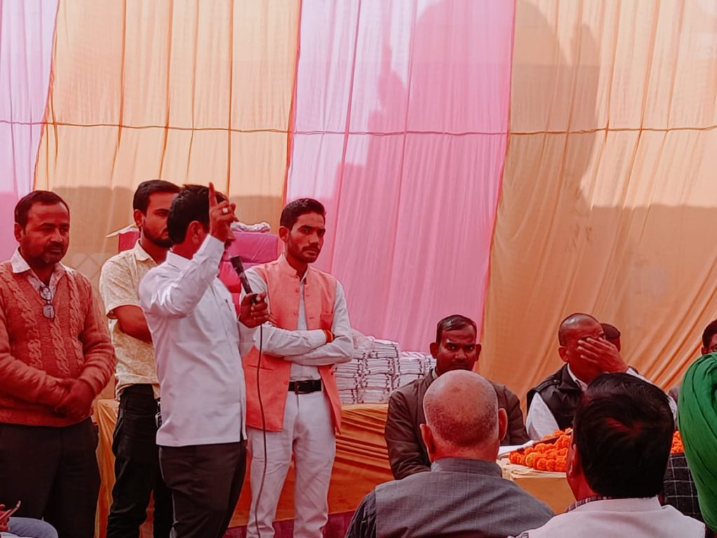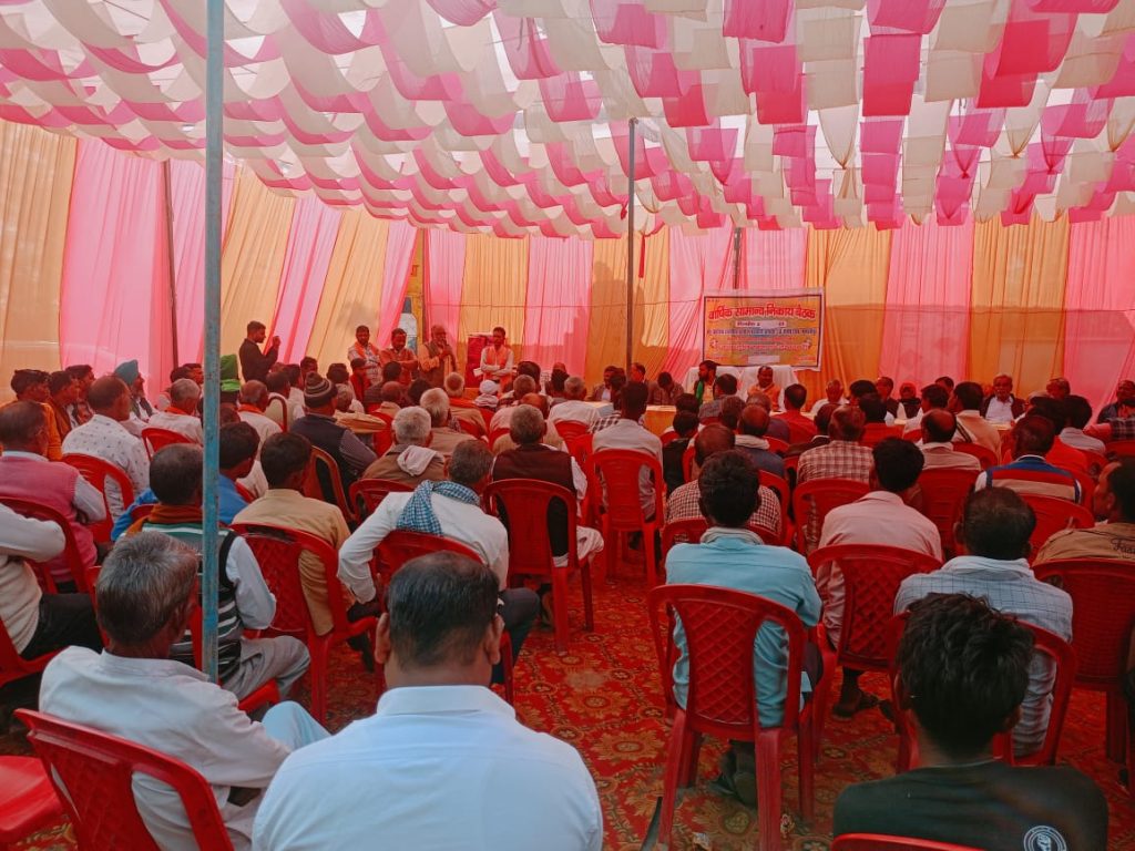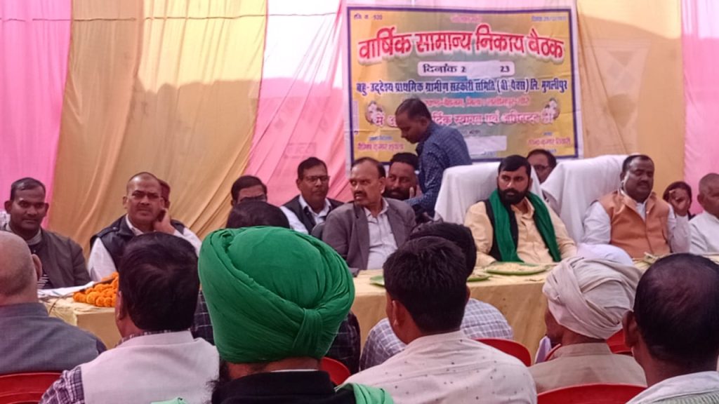 नीमगांव थाना क्षेत्र के गुलौला में स्थित बहु बहुद्देशीय प्राथमिक ग्रामीण सहकारी समिति बीo पैक्स मुगलीपुर पर में गुरुवार को वार्षिक सामान्य निकाय की बैठक का आयोजन किया गया। साधन सहकारी समिति से संबंधित किसानों को जानकारियां दी गईं। साधन सहकारी समिति के सचिव निमिष कुमार व समिति अध्यक्ष रवि तिवारी के द्वारा कास्तकारों के सम्मुख संतुलन पत्र 2023 व 2024 का ब्योरा दिया एवं वार्षिक लाभ सदस्यता अभियान व्यवसाय वृद्धि एवं कास्तकारों को फसली कर्ज बकाया भुगतान समय से करने संबंधी जानकारी दी। उर्वरक व्यवसाय को गत वर्ष में बढ़ोतरी के लिए शामिल किया गया। बैठक के मुख्य अतिथि बेहजम ब्लॉक प्रमुख प्रतिनिधि राम शंकर राज ने कास्तकारों को संबोधित करते हुए कृषक बीमा कर्ज सहित अन्य विस्तार से जानकारियां दीं। अध्यक्षता सहकारी समिति मुगलीपुर के अध्यक्ष रवि तिवारी ने की, जबकि संचालन अतुल मिश्रा ने किया। किसानों को संबोधित करते किसान नेता श्यामू शुक्ला ने DAP/NPK खाद की किल्लत को लेकर सूबे की मौजूदा सरकार पर निशाना साधा कहा अच्छे दिनों की बात करते थे देश के पीएम मोदी आज किसान को खाद मुहैया नहीं करा पा रही हैं सरकार, वही समित अध्यक्ष रवि तिवारी ने समित के सदस्यों व किसानों, पत्रकारों को फूलमालाओं समेत स्मृति चिन्ह भेंटकर अंग वस्त्र से सम्मानित किया इस मौके पर, पूर्व ब्लॉक प्रमुख अनिल वर्मा, सहकारिता मंत्री देवेश सिंह, समित संचालक पृथ्वीपाल गौतम, अतुल मिश्रा, सर्वेश शुक्ला, हेमनाथ, अरविंद मिश्रा,सत्यप्रकाश, बृज किशोर प्रधान गुलौला समेत दर्जनों काश्तकार उपस्थित रहे।