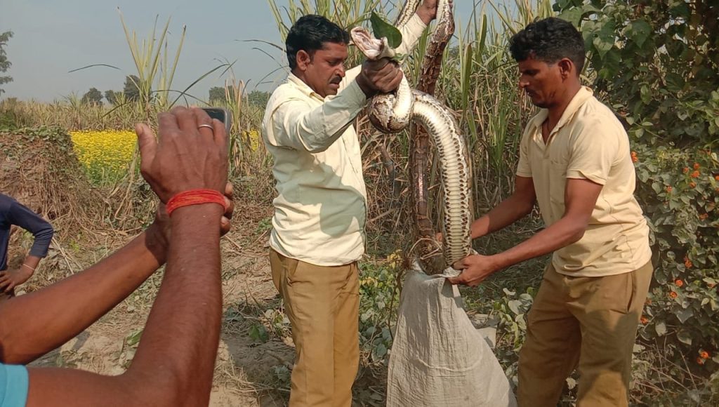 Ref.NO.21JUL2024LMP001713*सिंगाही थाना क्षेत्र के अंतर्गत ग्राम पंचायत नौरंगाबाद गांव के एक गन्ने के खेत में ग्रामीणों के द्वारा देखा गया विशालकाय अजगर अजगर को देख ग्रामीणों के द्वारा वन विभाग को सूचना दी गई वन विभाग को सूचना मिलते हैं तत्काल वन विभाग की टीम अजगर को रेस्क्यू करने पहुंची कड़ी मशक्कत के बाद बथुआ बीट के वाचर हकीमुद्दीन व इख्तियार अली ने अजगर को पड़कर नींबुआ झील में छोड़।