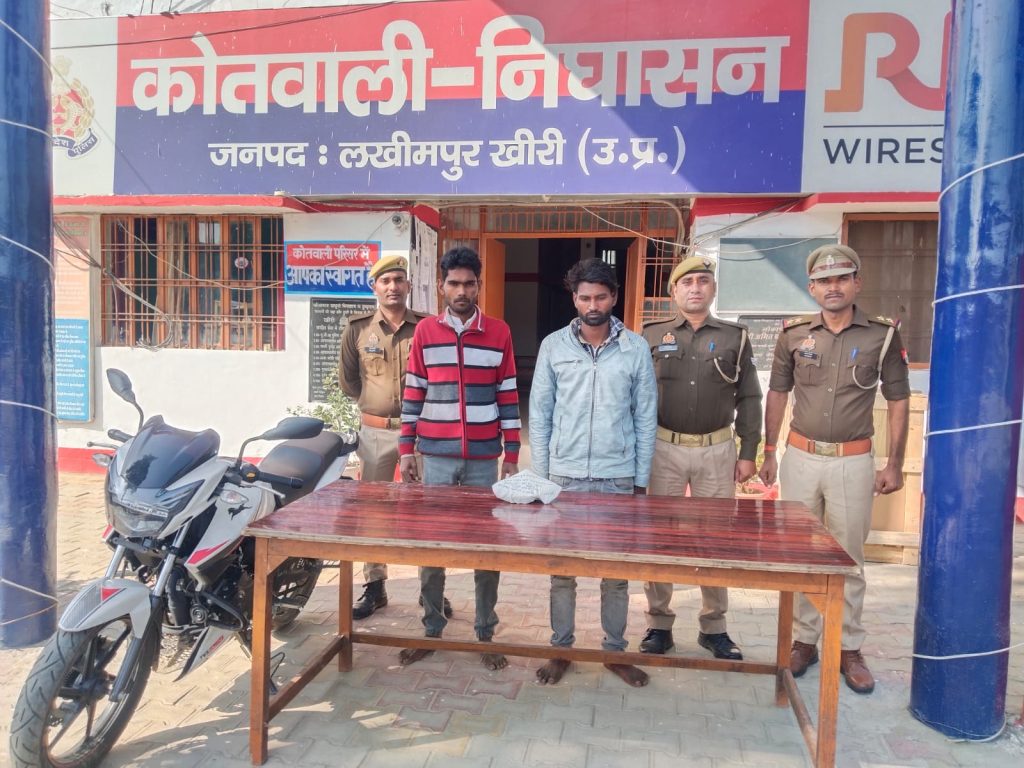 प्रo निo थाना निघासन महेश चंद्र के कुशल मार्ग मार्ग दर्शन में निघासन पुलिस बल द्वारा चोरी घटना में शामिल 1 राहुल कुमार पुत्र उत्तम कुमार निवासी बल्लीपुर थाना मझगई जिला खीरी करीब उम्र (22) वर्ष- 2 विमल कुमार पुत्र गया प्रसाद निवासी बालीपुर थाना मझगई खीरी करीब उम्र 23 वर्ष को बरुही फार्म को जाने वाली मार्ग बहत ग्राम दुबहा से करीब 20:25बजे गिरफ्तार किया गया है निर्माण अनुसार अभियुक्त गण अभियुक्त गण राहुल कुमार व विमल कुमार उपरोक्त के विरुद्ध में कार्यवाही कर न्यायिक अभिरक्षा में भेजा जा रहा है गौरतलब है की ग्राम खैरानी स्थित बरम बाबा मंदिर में 29 .11. 2024 दिन में मंदिर में स्थित माता मंदिर से सफेद धातु का छत्र चोरी हुआ था वादी श्री नंगा दास पुजारी बरम बाबा की तहरीर सूचना पर थाना निघासन मु0अ 0सं0318/2024धारा 305 बीएनएस बनाम अज्ञात पंजीकृत कराया था विवेचना के कम से अभियुक्त गण 1 राहुल कुमार पुत्र उत्तम कुमार निवासी बालीपुर थाना मझगई जिला खीरी 2 विमल कुमार पुत्र गया प्रसाद निवासी बालीपुर थाना मझगई जिला खीरी का नाम प्रकाश में आया
