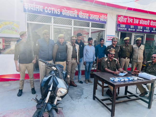 धौरहरा खीरी। पुलिस अधीक्षक,अपर पुलिस अधीक्षक खीरी व क्षेत्राधिकारी धौरहरा के कुशल पर्यवेक्षण/अभियान के क्रम में रोकथाम जुर्म जरायम व गिरफ्तारी वांछित वारंटी, चेकिंग वाहन व्यक्ति वस्तु के अनुपालन में लोगों से मोबाइल लूटने वाले गिरोह को गिरफ्तार करने में धौरहरा पुलिस को सफलता मिली है।इस दौरान तीन आरोपियों को गिरफ्तार कर जेल भेज दिया गया।पुलिस अधीक्षक खीरी गणेश प्रसाद साहा,अपर पुलिस अधीक्षक पूर्वी पवन गौतम व क्षेत्राधिकारी धौरहरा प्रीतम पाल सिंह के कुशल पर्यवेक्षण में धौरहरा पुलिस को क्षेत्र में हो चुकी मोबाइल लूट काण्ड घेराबंदी करते हुए तीन आरोपियों को क्षेत्र के रंजीत गंज पुल के पास से गिरफ्तार किया। कोतवाली में प्रेस वार्ता करते हुए प्रभारी निरीक्षक सुरेश कुमार मिश्रा ने बताया वादी मुकदमा आदिल ने सूचना दी कि सिसैया से आटो से आते वक्त बाइक सवार तीन युवकों ने सैमसंग मोबाइल लूट लिया जिस पर पुलिस ने मुकदमा अपराध संख्या 563/2024 की धारा 309(9)दर्ज कर आरोपियों की तलाश में टीमें गठित कर तीन लोगों के पास भिन्न-भिन्न स्थानों से चोरी किए 5 मोबाइल फोन,एक पर्स,इण्डियन बैक की पासबुक,एक तमंचा 12 बोर 2 कारतूस,घटना में प्रयुक्त काली मोटरसाइकिल सुजुकी lntufer नंबर U P-34-AS -0339 बरामद कर ओम गुप्ता उर्फ दीपांशु पुत्र स्व0 शिव नारायण, विष्णु तिवारी उर्फ बृजेश पुत्र मुकेश,संग्राम सिंह पुत्र राजकुमार निवासी मोहल्ला सुभाष नगर,देवकली रोड कोतवाली सदर खीरी को क्षेत्र के रंजीत गंज पुल के पास की गई चेकिंग के दौरान गिरफ्तार करने में कोतवाली के उप निरीक्षक बीरेंद्र सिंह,अजय सिंह,हे0 का0 राकेश राजपूत, रजनीश,विशाल रोहित व शोभित कुमार को सफलता मिली। प्रेस कॉन्फ्रेंस में कोतवाल सुरेश मिश्रा ने बताया कि गिरफ्तार आरोपियों द्वारा कोतवाली सदर, खमरिया,सिधौली, मिहींपुरवा, बहराइच में लूट की घटनाएं कारित की गई।