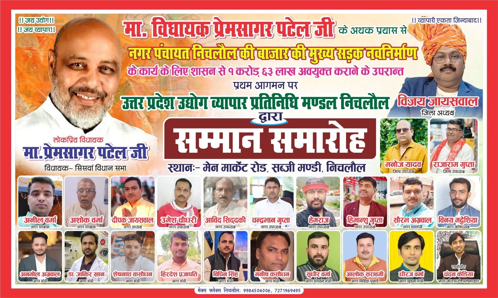 महराजगंज।नगर पंचायत निचलौल की बाजार की मुख्य सड़क नवनिर्माण के कार्य के लिए उत्तर प्रदेश शासन से १ करोड़ ६३ लाख अवमुक्त करवाने के उपरान्त प्रथम आगमन पर लोकप्रिय विधायक प्रेम सागर पटेल को उत्तर प्रदेश उद्योग व्यापार प्रतिनिधि मण्डल निचलौल द्वारा दिनाँक 23 दिसम्बर को आयोजित सम्मान समारोह में व्यापारियों द्वारा सम्मान किया जाएगा। इस कार्यक्रम को मेन मार्केट के सब्जी मंडी में दोपहर १ बजे आयोजित किया जाएगा।यह जानकारी निचलौल के प्रतिष्ठित प्लाई एवम हार्डवेयर व्यपारी आलोक सरावगी और दीपक जायसवाल के द्वारा दिया गया है।