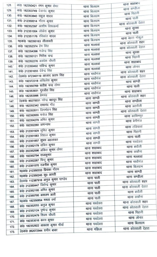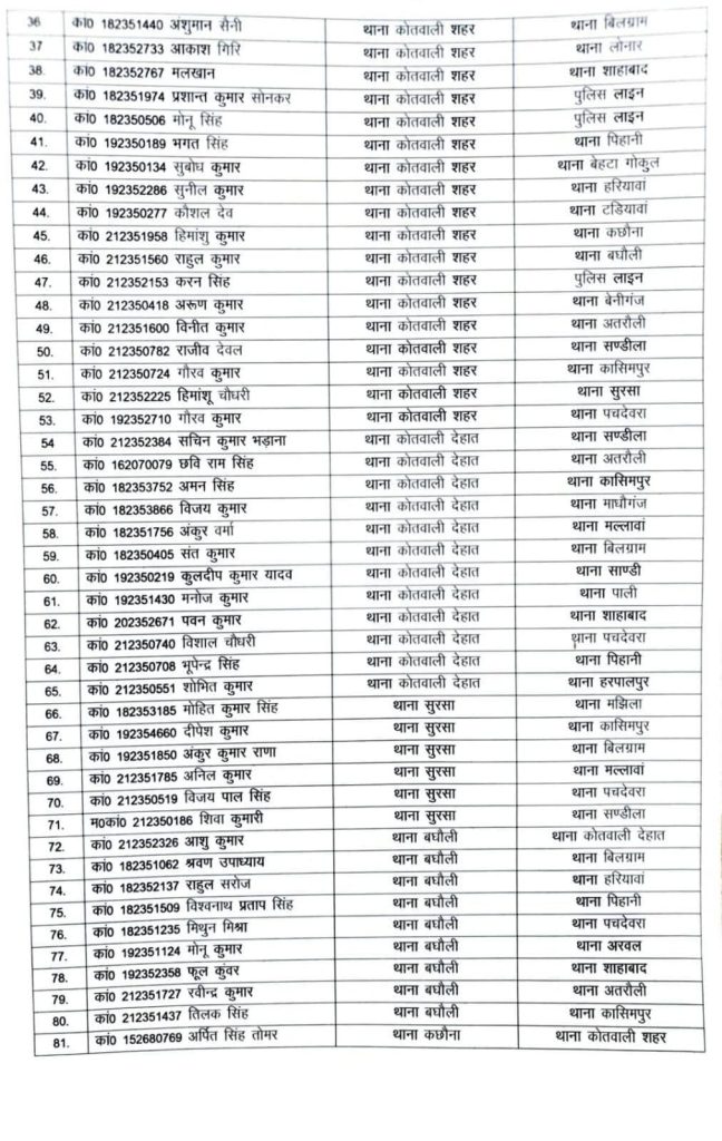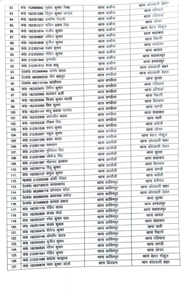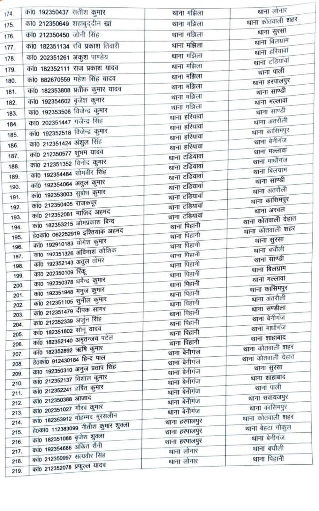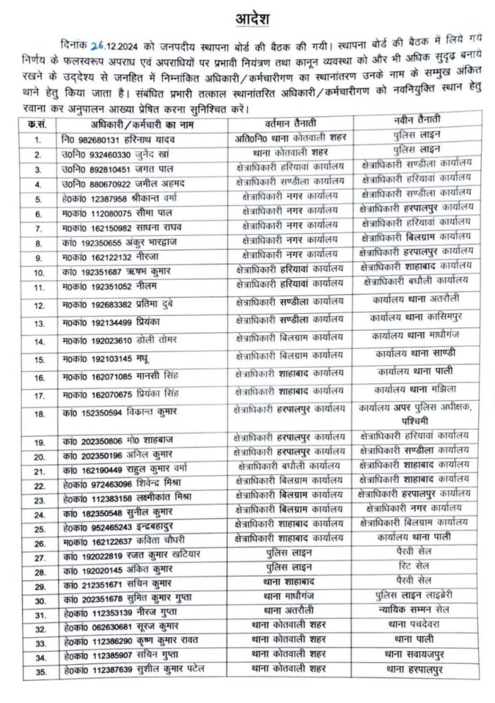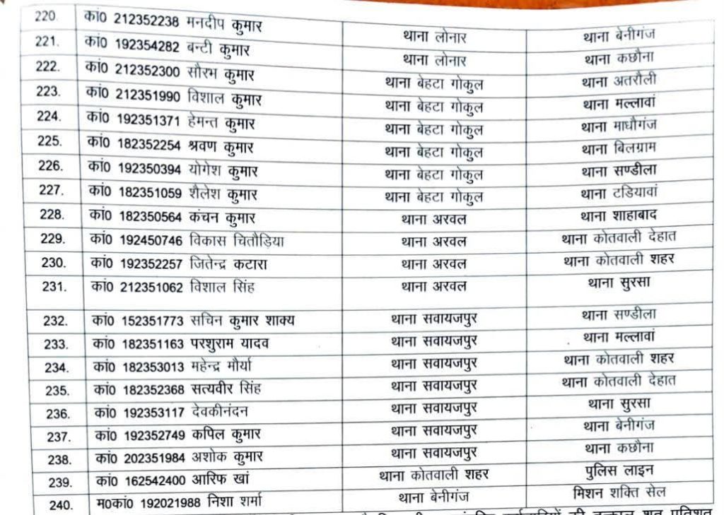 हरदोई।पुलिस विभाग मे फिर चली एक बार तबादला एक्सपरेक्स।हरदोई एसपी नीरज कुमार जादौन ने एक इस्पेक्टर सहित 240 पुलिस कारमियो के कार्य क्षेंत्र मे किया फेरबदल।