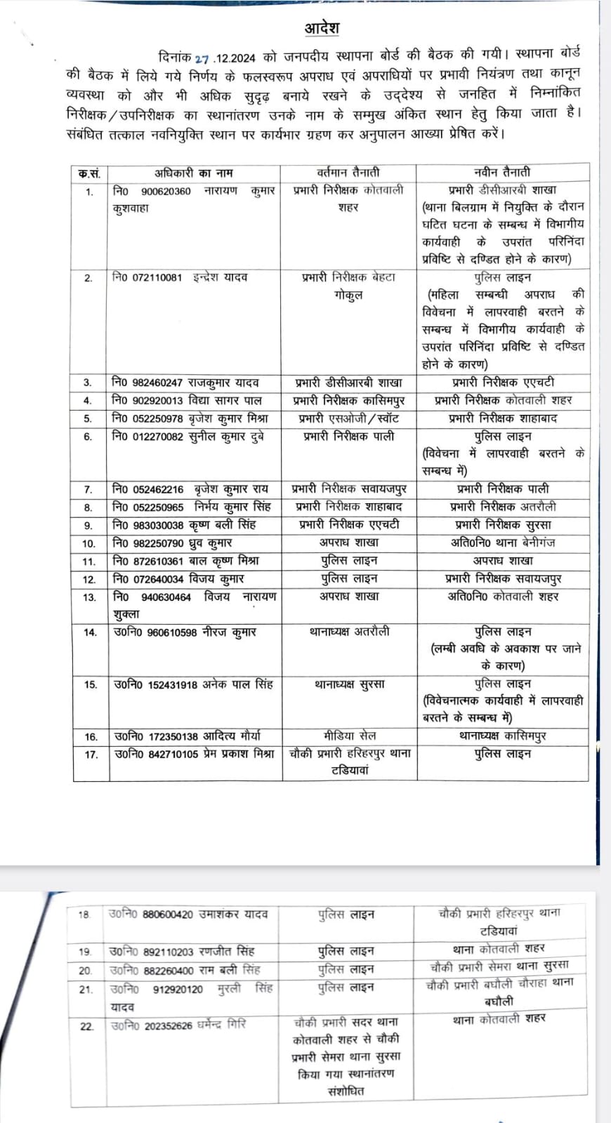 *बिग ब्रेकिंग हरदोई*-एसपी नीरज कुमार जादौन ने की बड़ी कार्यवाही-13 इंस्पेक्टर व 9 उपनिरीक्षकों समेत 22 पुलिस कर्मियों के किये तबादले-कई थाना प्रभारियों पर भी गिरी गाज-शहर कोतवाली प्रभारी INS नारायण कुशवाहा को DCRB प्रभारी बनाया -INS विद्या सागर पाल बने शहर कोतवाली प्रभारी -बेहटागोकुल थानाध्यक्ष Ins इन्द्रेश यादव को किया लाइन हाज़िर-पाली थानाध्यक्ष ins सुनील कुमार दुबे को किया लाइन हाज़िर-अतरौली थानाध्यक्ष Si नीरज कुमार को किया लाइन हाज़िर-सुरसा थानाध्यक्ष SI अनेक पाल को किया लाइन हाज़िर-चौकी प्रभारी हरिहरपुर SI प्रेम प्रकाश मिश्रा -SOG प्रभारी INS बृजेश कुमार मिश्रा बने शाहाबाद कोतवाली प्रभारी-INS निर्भय कुमार सिंह बने अतरौली थाना प्रभारी -INS कृष्णबलि सिंह बने सुरसा थाना प्रभारी-Ins विजय कुमार बने सवायजपुर थाना प्रभारी-उमा Si शंकर यादव बने टड़ियाँवा हरिहरपुर चौकी प्रभारी-शहर कोतवाली की सदर चौकी प्रभारी Si धर्मेंद्र गिरी का चौकी प्रभारी सेमरा का तबादला निरस्त, कोतवाली शहर में बने रहेंगे।-राधा नगर चौकी प्रभारी Si विनोद कुमार शर्मा किये गये निलंबित।