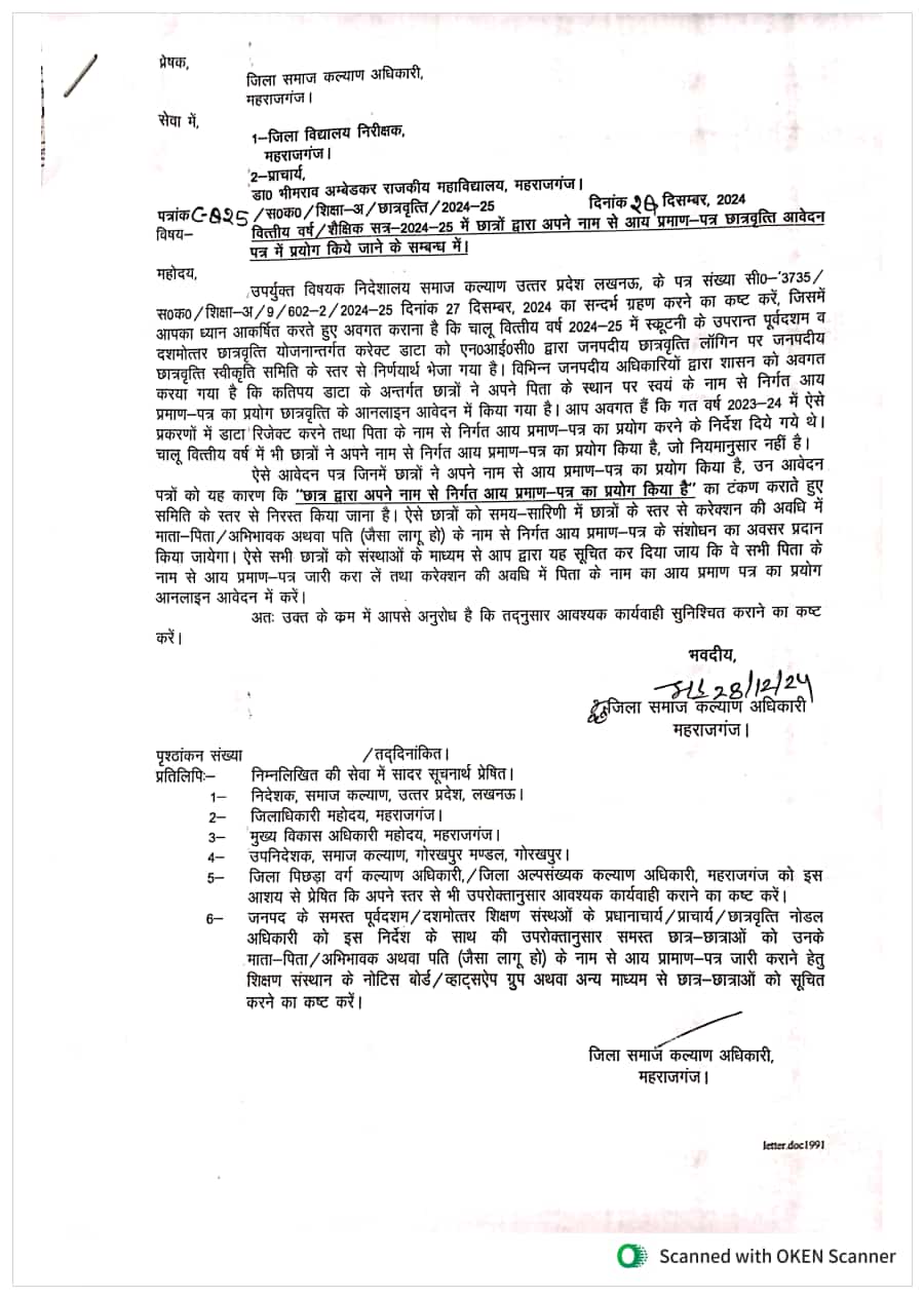 महराजगंज।उत्तर प्रदेश छात्रवृत्ति एवं शुल्क प्रतिपूर्ति योजना 2024 -25 में आवेदन करते समय अपने पिता के आय प्रमाण पत्र के स्थान पर अपने नाम से जारी आय प्रमाण पत्र का प्रयोग कर फॉर्म भरें हैं तो ऐसे छात्रों का आवेदन फॉर्म रिजेक्ट हो जाएगा।,इस प्रकार पूर्व में शासन द्वारा जारी निर्देशानुसार वित्तीय वर्ष 2024-25 में छात्रवृत्ति आवेदन में जिन छात्र छात्राओं ने अपने नाम का आय प्रमाण पत्र ऑनलाइन वेरीफाई किया है,ऐसे सभी आवेदन नियमानुसार नही है।