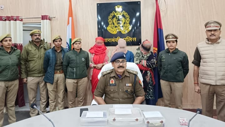 बाराबंकी। थाना रामसनेहीघाट पुलिस टीम द्वारा मादक पदार्थों की तस्करी करने वाली 03 महिलाओं को गिरफ्तार कर उनके कब्जे से 750 ग्राम अवैध स्मैक (अंतर्राष्ट्रीय कीमत करीब 75 लाख रुपये) व नकदी बरामद किए। जनपद में अपराध पर प्रभावी नियंत्रण एवं जनपद में मादक पदार्थों की तस्करी की रोकथाम व अभियुक्तों की गिरफ्तारी हेतु चलाए जा रहे अभियान के क्रम में शनिवार को थाना रामसनेहीघाट पुलिस टीम द्वारा मैनुअल इंटेलीजेंस की मदद से मादक पदार्थों की तस्करी करने वाली तीन महिलाएं मीना पत्नी जय प्रकाश पाठक उर्फ किन्नी निवासिनी कोटवा सड़क थाना रामसनेहीघाट जनपद बाराबंकी, रोशनी पत्नी शिवम पाठक निवासिनी कोटवा सड़क थाना रामसनेहीघाट जनपद बाराबंकी और कुमारी शिवानी पुत्री जय प्रकाश पाठक निवासिनी कोटवा सड़क थाना रामसनेहीघाट जनपद बाराबंकी को कोटवा सड़क से गिरफ्तार किया गया।