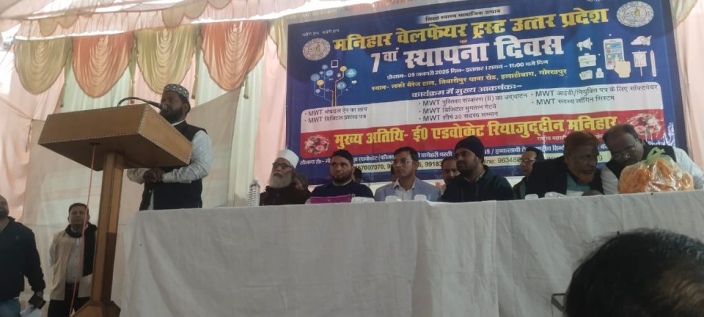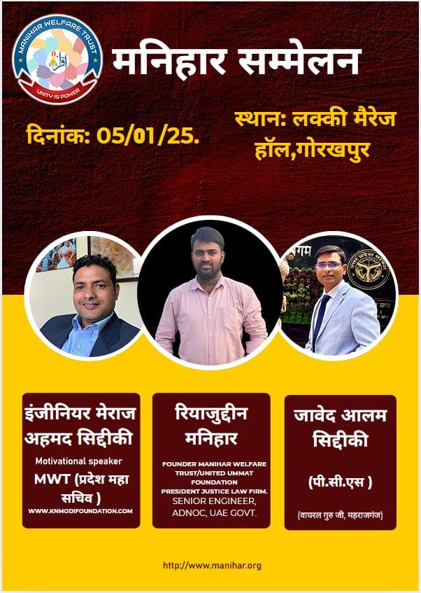 गोरखपुर। मनिहार वेलफेयर ट्रस्ट ने लकी मैरिज हॉल, गोरखपुर में बेहद सफल मनिहार सम्मेलन का आयोजन किया। इस कार्यक्रम में विभिन्न क्षेत्रों से समुदाय के सदस्यों की भारी उपस्थिति देखी गई, जो शैक्षिक उत्थान, महिला सशक्तिकरण और तकनीकी एकीकरण के लिए एकजुट प्रयासों की दिशा में एक महत्वपूर्ण कदम है। सभा में मनिहार समुदाय के प्रमुख वक्ता और नेता शामिल थे।इंजीनियर मेराज अहमद सिद्दीकी (मोटिवेशनल स्पीकर और राज्य महासचिव, एमडब्ल्यूटी), जिन्होंने शैक्षिक प्रगति और सामुदायिक एकता के लिए अपने दृष्टिकोण से दर्शकों को प्रेरित किया।