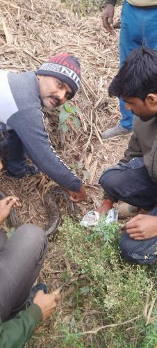 रास्ते से निकल रहे राहगीर व किसानों ने बताया कि कुछ राहगीरों को अचानक लगभग आठ से नौ फीट लंबा अजगर दिखाई दिया राहगीरों द्वारा अजगर देखते ही पसीने छूट गए जिसके बाद बड़ी संख्या में आस पास के किसान विनीत कुमार जितेन्द्र यादव अमित यादव सहित तमाम किसान मौके पर पहुंच गए जहा किसान नरेंद्र यादव ने रेंजर गजेंद्र बहादुर सिंह को सूचना दी सूचना मिलते ही रेंजर गजेंद्र बहादुर सिंह तत्काल टीम सहित घटना स्थल पर जा पहुंचे जहां वन विभाग की टीम ने रेस्क्यू ऑपरेशन चलाकर अजगर को अपने कब्जे में लिया जिसके बाद किसान व राहगीरो ने राहत की सांस ली।