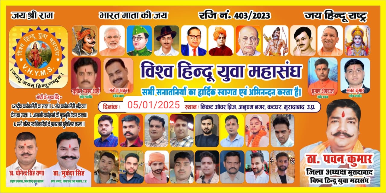 गोष्ठी का शुभारंभ प्रभु श्री रामचंद्र के पूजन और दीप प्रज्जलन के साथ, माननीय राष्ट्रीय उपाध्यक्ष जी ने अपनी सनातन संस्कृति और भारत वर्ष पर हुए आक्रांताओं के अत्याचार को बताए हुए। सभी सनातनियों को संगठित करने का आवाहन किया। राष्ट्रीय प्रवक्ता और प्रदेश अध्यक्ष जी उद्बोधन ने सभी हिंदुओं को जागृत किया। और संघ के प्रचार प्रसार के सभी सनातनी हिंदू भाई बहनों को संगठित करने का आवाहन किया मुरादाबाद और जिला महत्वपूर्ण नियुक्ति की गई। और राष्ट्रीय अध्यक्ष जी और राष्ट्रीय कार्यकारणी समिति के सार्वमत से माननीय राष्ट्रीय उपाध्यक्ष जी ठाकुर योगेंद्र सिंह राणा जी को संघ का संघ संचालक नियुक्त किया।