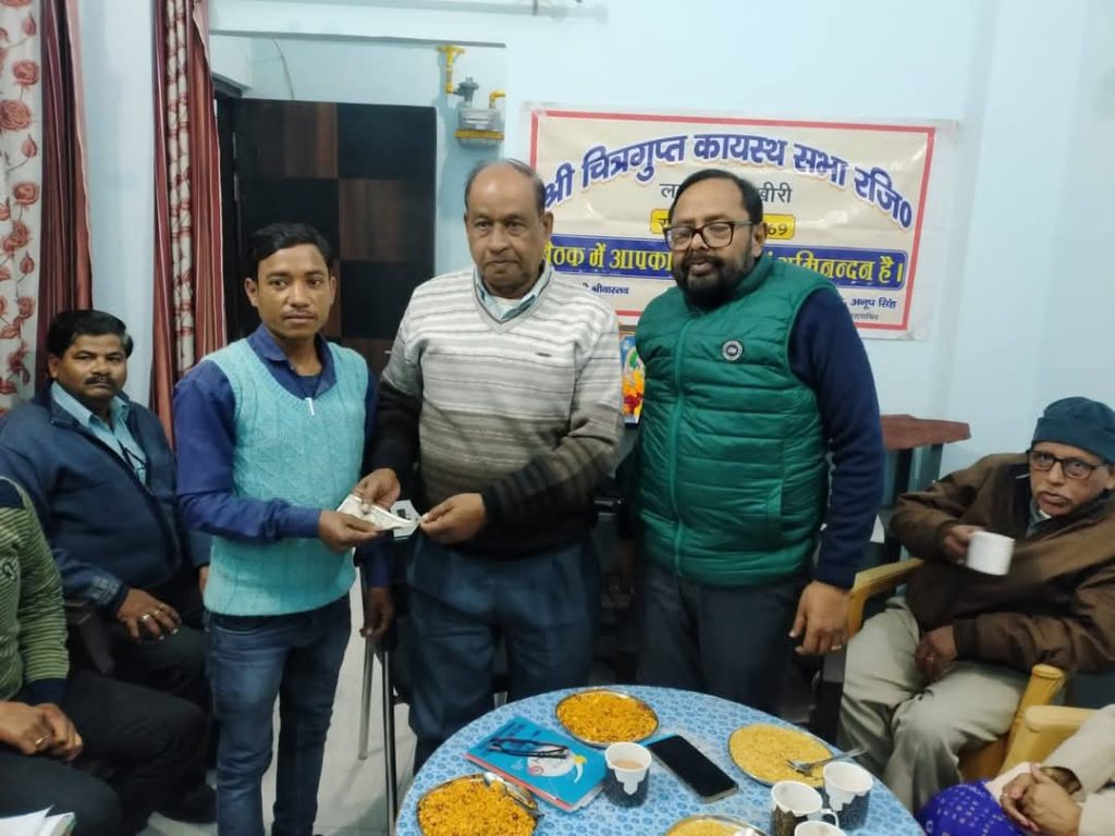 भगवान चित्रगुप्त की स्तुति, आराधना एवं आरती के साथ शुरू हुई इस बैठक में संस्था महामंत्री चित्रांश अनूप सिंह ने पिछली कार्यवाही की पुष्टि के बाद पूरे महीने संस्था की प्रेरणादाई सक्रियता पर बिंदुवार प्रकाश डाला। तदोपरांत कार्यक्रम को संबोधित करते हुए संस्था की महिला शाखा अध्यक्षा अर्चना श्रीवास्तव ने सभी सदस्यों से संस्था के कार्यक्रमों में नियमित एवं ससमय आने की अपील के साथ साथ अपने साथ कम से कम एक कायस्थ को लाने की अपील की। इस बीच निजी क्षेत्र में मेहनत कर अपने परिवार का जीविकोपार्जन कर रहे आर्थिक रूप से कमजोर एक व्यक्ति के दो बच्चों की शिक्षा में आर्थिक संकट को संज्ञान लेते हुए संस्था पदाधिकारियों ने आपसी सहयोग से त्वरित तौर पर 6 हजार रुपए एकत्र कर उस व्यक्ति की सहायता करते हुए बच्चों की निर्विघ्न शिक्षा का मार्ग प्रशस्त कर प्रेरणादाई मिसाल पेश की। बच्चों की शिक्षा के लिए सहायता राशि पाकर जरूरतमंद व्यक्ति ने सजल नेत्रों ने संस्था पदाधिकारियों के प्रति कृतज्ञता भी व्यक्त की। चित्रांश अजय कुमार श्रीवास्तव ने श्री चित्रगुप्त कायस्थ धर्मशाला के विकास के लिए 5100 की सहयोग राशि देते हुए संस्था के कायस्थ धर्मशाला विकास एवं सुंदरीकरण विचार पर बल दिया। अपने अध्यक्षीय संबोधन में बैठक को संबोधित करते हुए संस्थाध्यक्ष डॉक्टर ओम प्रकाश श्रीवास्तव ने संस्था के आगामी प्रस्तावित कार्यक्रम 23 जनवरी को कलम दवात चौराहे पर सुभाष चंद्र बोस जयंती के लिए शाम 4 बजे एवं श्री दुर्गे चित्रगुप्त मंदिर में भगवान चित्रगुप्त आरती के लिए शाम साढ़े 6 बजे पहुंचने की अपील की। समापन संस्था संरक्षक, अभाकाम प्रदेश वरिष्ठ उपाध्यक्ष श्री खरे ने अपने ओजस्वी वक्तव्य के साथ किया। अंत में मेजबानी कर रहे मंत्री इंजीनियर राजेश श्रीवास्तव ने सुरुचिपूर्ण जलपान के साथ उपस्थित जनों का स्वागत भी किया। इस अवसर पर कोषाध्यक्ष लोकेंद्र श्रीवास्तव, उपाध्यक्ष रवि कांत श्रीवास्तव, प्रदीप सक्सेना मुकेश, मनीष श्रीवास्तव, नितिन श्रीवास्तव, अभिषेक श्रीवास्तव, संजय श्रीवास्तव, युवा शाखा मीडिया प्रभारी चित्रांश स्पर्श सिन्हा आदि लोग उपस्थित रहे