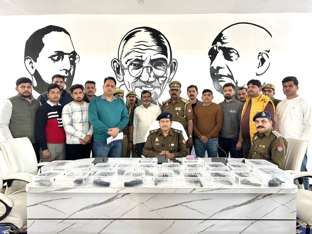 पुलिस अधीक्षक कन्नौज विनोद कुमार के निर्देशन में जनपद कन्नौज में अपराध एवं अपराधियों के विरूद्व चलाये जा रहे अभियान के क्रम में, अपर पुलिस अधीक्षक कन्नौज अजय कुमार के पर्यवेक्षण में, क्षेत्राधिकारी छिबरामऊ ओमकारनाथ के नेतृत्व में, प्रभारी निरीक्षक अजय कुमार अवस्थी थाना छिबरामऊ ,निरीक्षक त्रदीप सिंह प्रभारी सर्विलान्स सेल व उ0नि0 कमल भाटी प्रभारी एस0ओ0जी0 की संयुक्त टीम द्वारा मुखविर खास की सूचना पर दिनांक 21.01.2025 को थाना छिबरामऊ क्षेत्र में पापा होटल के पास जी0टी0 रोड से अभियुक्त लालाराम उर्फ हरीशंकर उर्फ पिन्टू पुत्र स्व0 रामनिवास नि0 ग्राम फतेहपुर थाना अलीगंज जनपद एटा को गिरफ्तार किया गया, जिसके कब्जे से 19 देशी अवैध तमंचे 315 बोर, 08 जिन्दा कारतूस 315 बारे , 3500/- रूपये व एक अदद रियलमी मोबाइल फोन एवं एक माटेर साईकिल बरामद गयी। बरामदगी के आधार पर थाना छिबरामऊ पर मु0अ0सं0-46/25 धारा-3/25 आर्म्स एक्ट बनाम अभियुक्त लालाराम उर्फ हरीशंकर उर्फ पिन्टू उपरोक्त पंजीकृत किया गया । विधिक कार्यवाही करते हुए अभियुक्त उपरोक्त को माननीय न्यायालय के समक्ष पेश किया जा रहा है ।
