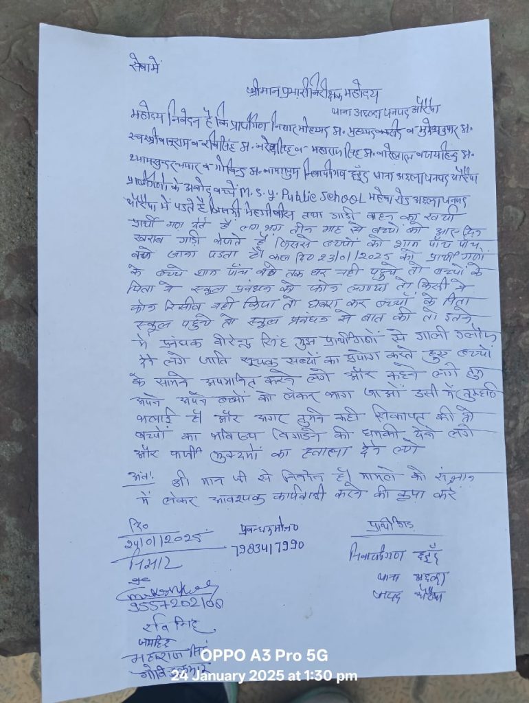 औरैया थाना में शिकायत करने गए स्कूली बच्चों के पिता को शिकायत करना पड़ा भारी पुलिस ने थाने में बैठाया एक तरफा पुलिस की कार्यवाही से बच्चों के पिता को नही मिला न्यायएम एस वाई पब्लिक स्कूल महेवा रोड पर स्थित स्कूल में पड़ने वाले बच्चों के पिता का आरोप लेट लपेट बच्चों को छोडा जाता बच्चों को घर कल दिनांक 23 /1/2025 को शाम पांच बजे तक जब स्कूल से बच्चे घर नही पहुंचे तो बच्चो के घर के लोग पहुंचे थे स्कूल बच्चों के पिता ने स्कूल प्रबंधन पर लापरवाही बरतने का लगाया आरोपस्कूल प्रबंधक की दवंगई के चलते रोज स्कूल के बच्चों को टाइम वे टाइम पहुंचाया जाता था घर।