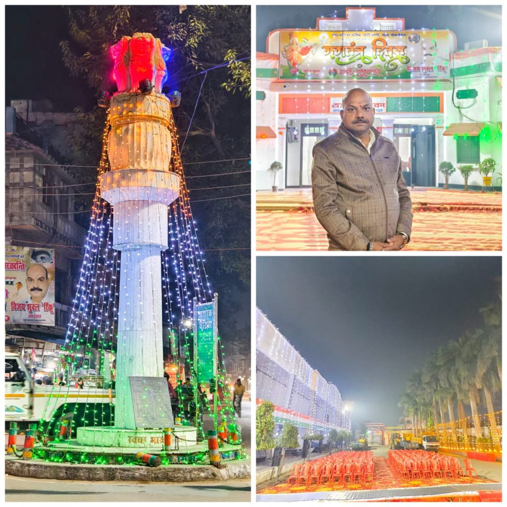 गोला गोकरण नाथ में 26 जनवरी गणतंत्र दिवस के अवसर पर शहर के प्रमुख स्थलों को तिरंगे की रोशनी से सजाया गया। नगर पालिका अध्यक्ष विजय शुक्ला रिंकू के नेतृत्व में नगर पालिका भवन, अशोक चौराहा और इंद्रा पार्क को विशेष रूप से प्रकाश व्यवस्था के माध्यम से तिरंगे के रंगों में सजाया गया। इस पहल से पूरा क्षेत्र देशभक्ति की भावना से सराबोर हो गया।