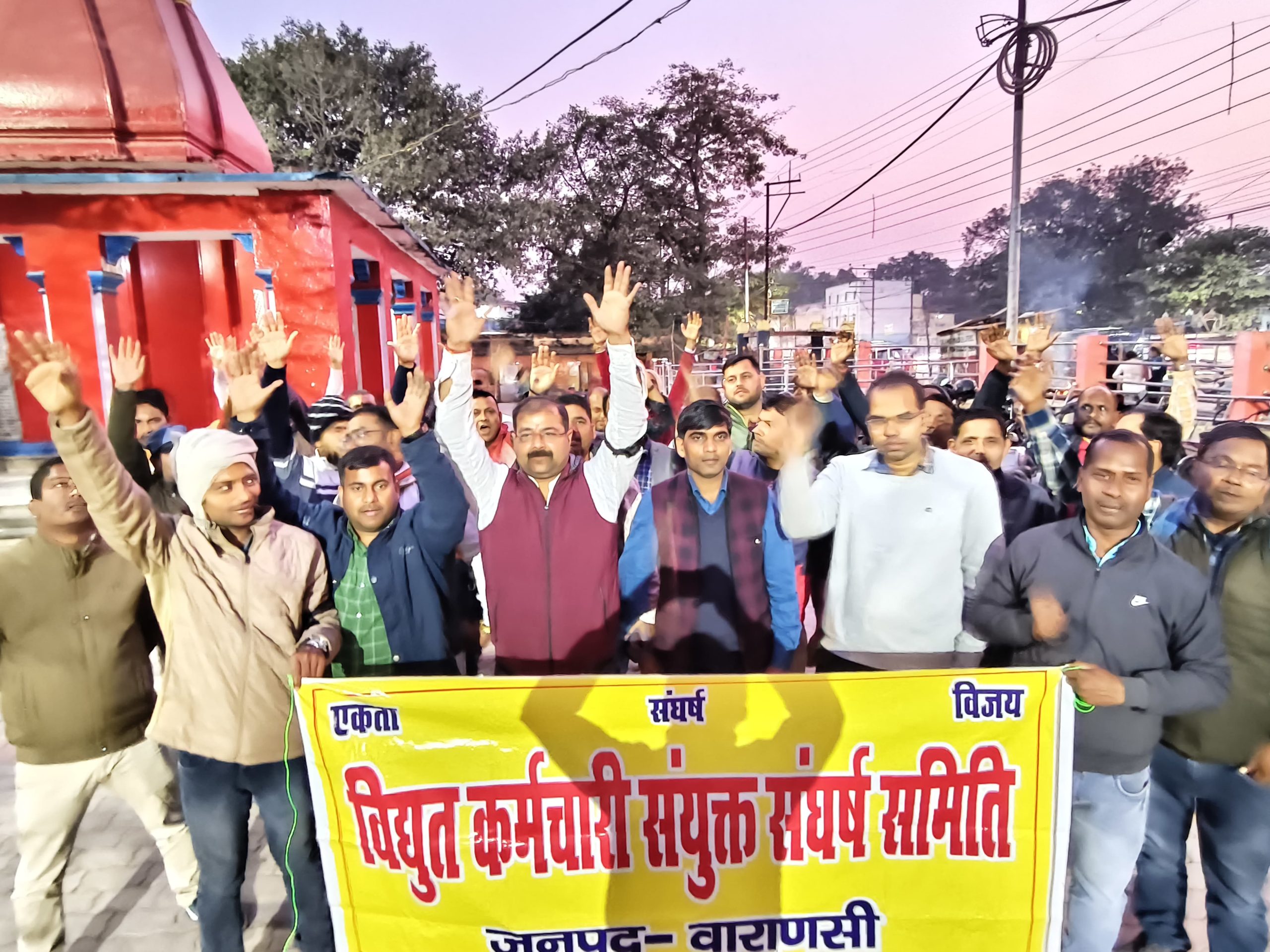 वाराणसी-1फरवरी । संघर्ष समिति उ0प्र0 बैनर तले आज बनारस के भिखारीपुर स्थित हनुमानजी मंदिर पर एक विरोध सभा आयोजित की गयी जिसमे लंका पर विधुत स्पर्शाघात से चोटिल कर्मचारी के जल्द स्वस्थ होने की कामना कर बिजलिकर्मियो ने जल्द विरोध सभा को किया सम्प्पन्न।